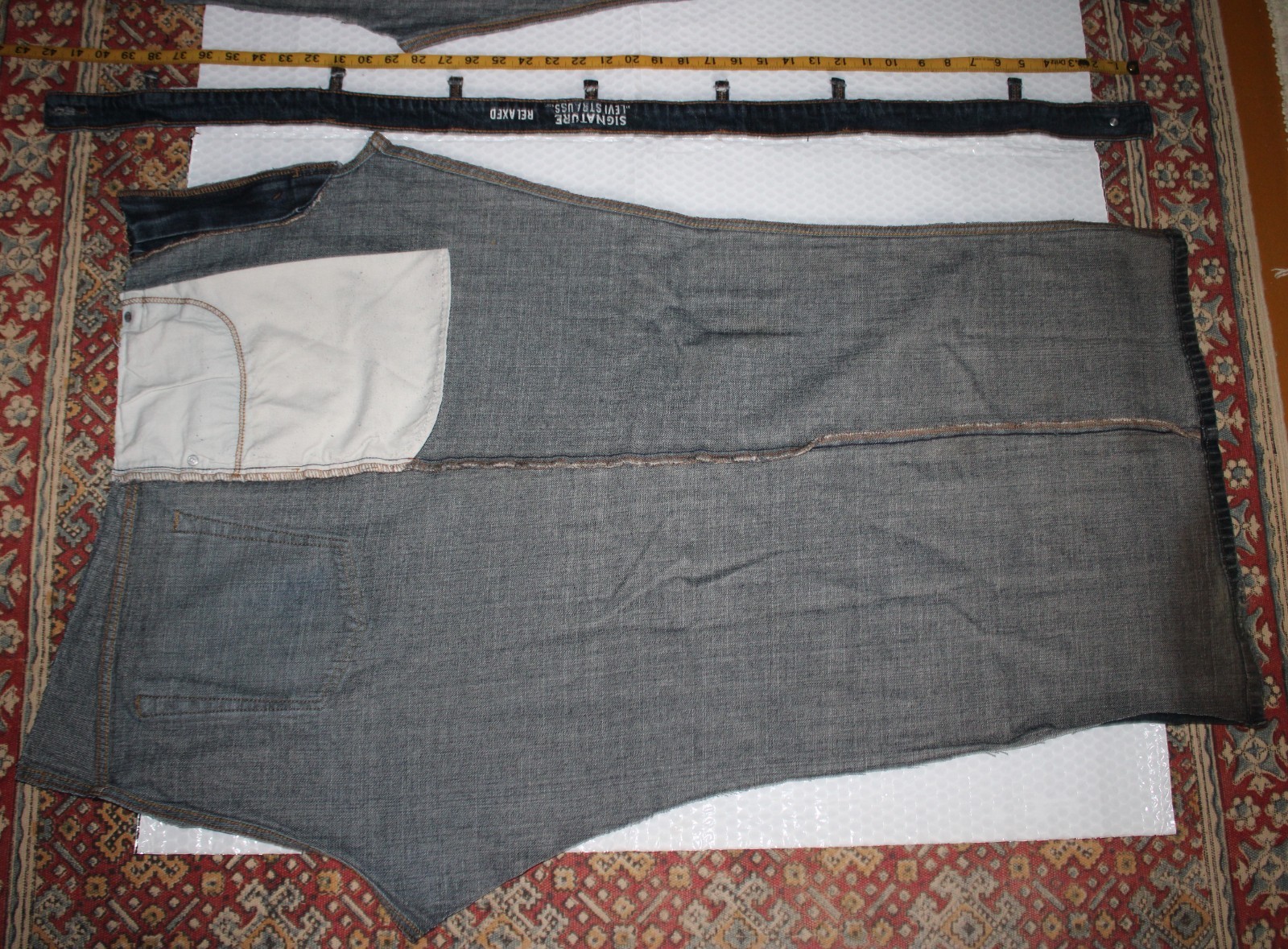 Lot of 3 pieces. Cut from a single pair of Levis Signature Relaxed men's 100% cotton pants. Brass zipper fly. Blue in color. Shows age and previous use with wear, fading, fraying at the cuffs and stains. Weighs 1 pound and 14 ounces packaged. Shipping to the lower 48 states only.