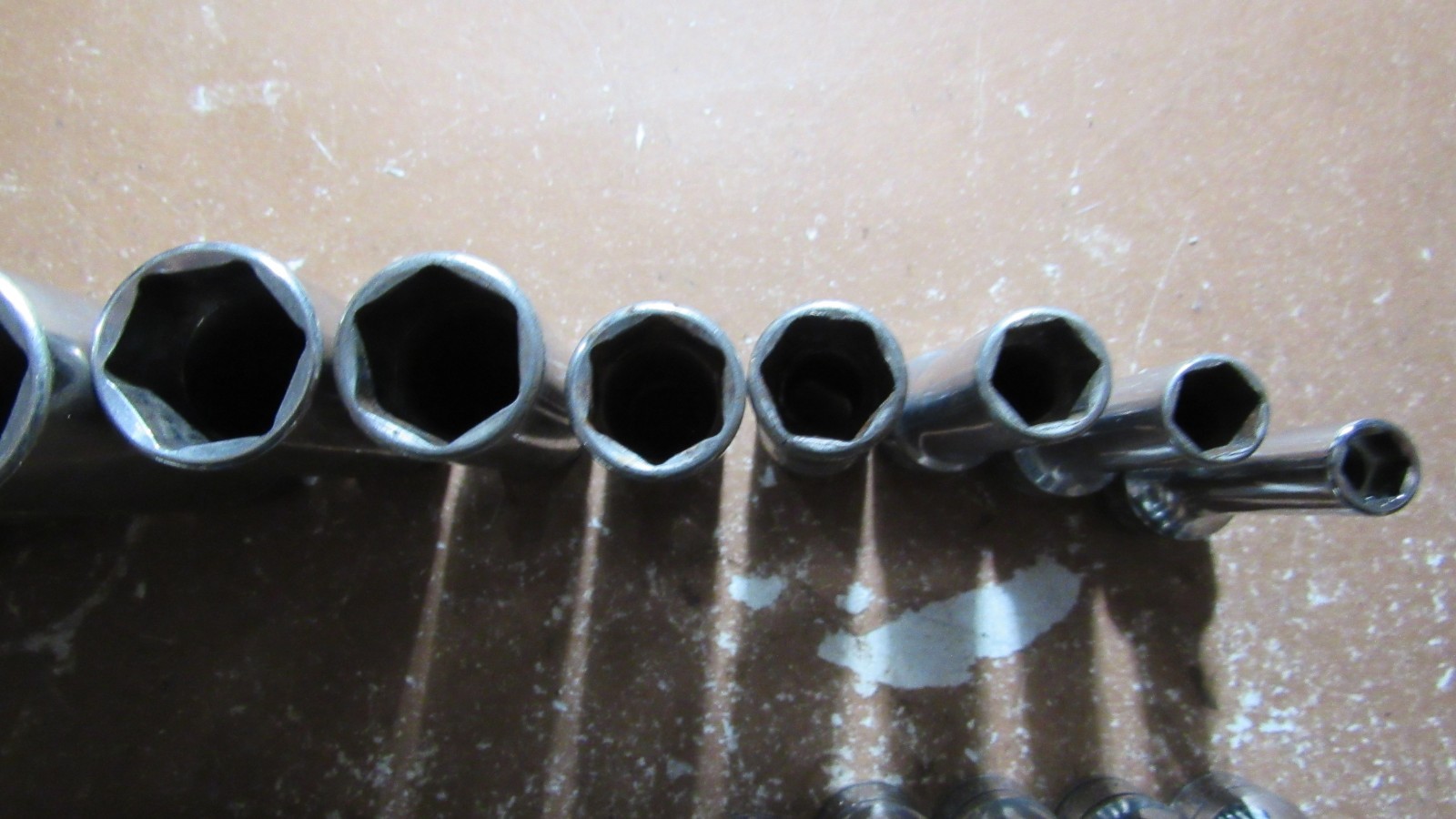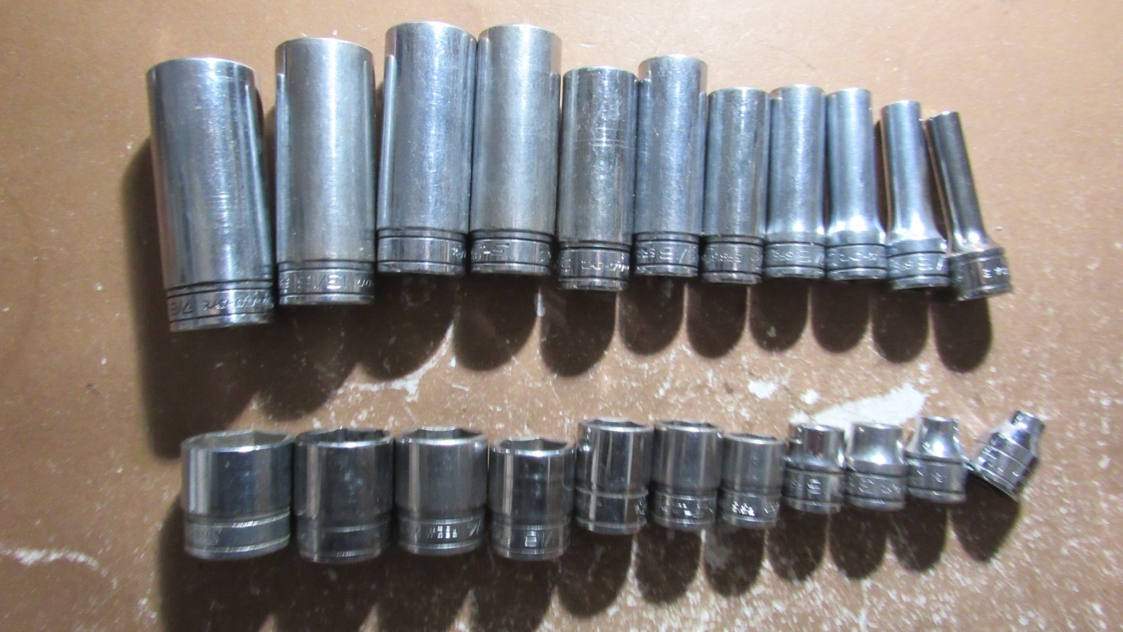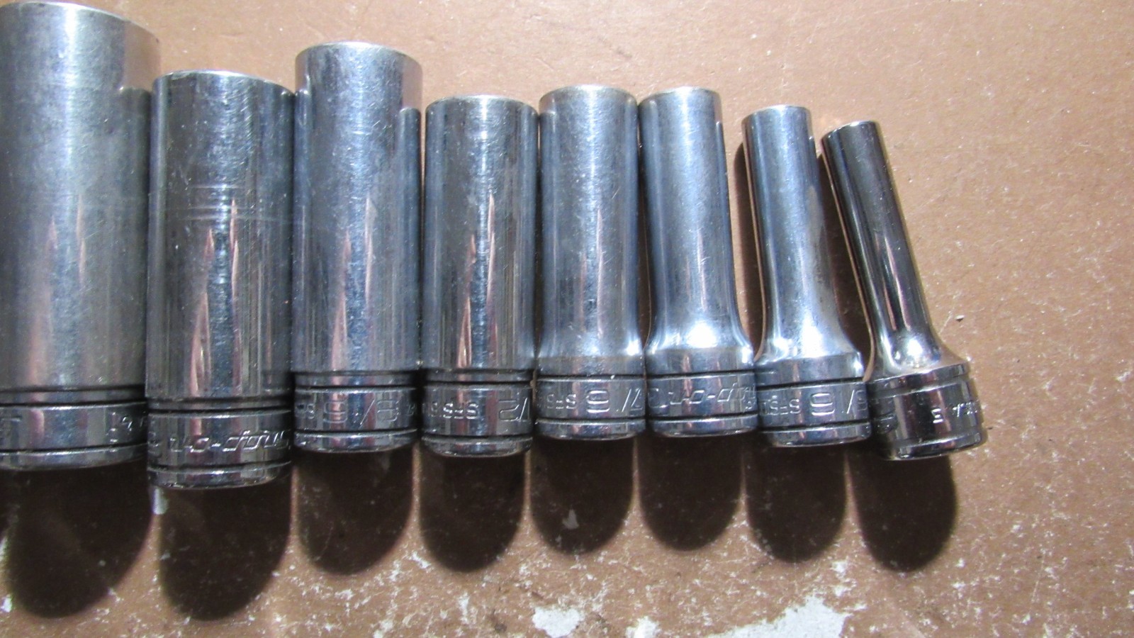 Snap On 3/8" drive SAE socket sets, shallow and deep, in good to very good condition. Sizes are 1/4" through 7/8", 6 point. No personal ID marks, very little impact use. New style script. Sockets only, no storage organizers included. Buyer pays 18.00 for Priority Mail shipping with Signature Tracking included.