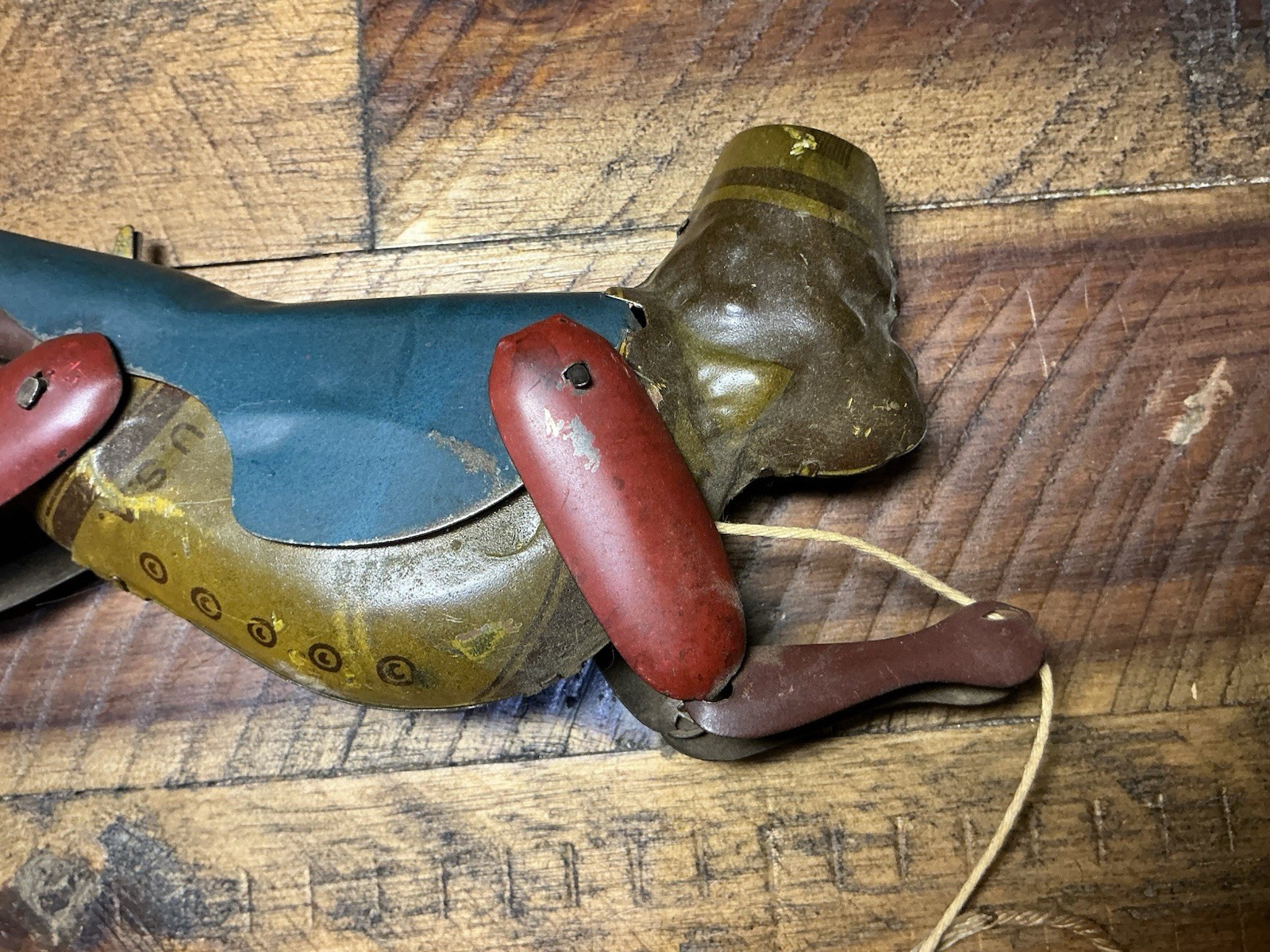 Antique vintage tin monkey climbing string toy made in USA works great! He climbs up and down the string! This monkey measures 8 inches long and about 2.5 inches wide. It does have a little bit of wear from him climbing but i think he is in super condition for its age! any questions? Please feel free to ask me, i will be happy to help you!! Thank you so much for looking!! Please have a peek at my other auctions for more tin toys. Thanks!