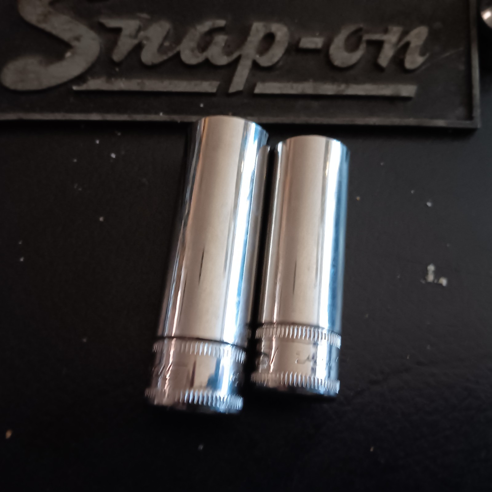 Snap On METRIC deep 3/8"dr sockets(2), 13 & 14mm, 12pt. NEW. SFM13& SFM14.. Minor shelf wear. From a Snap On X-mas party auction. Clean, unused. No initials.