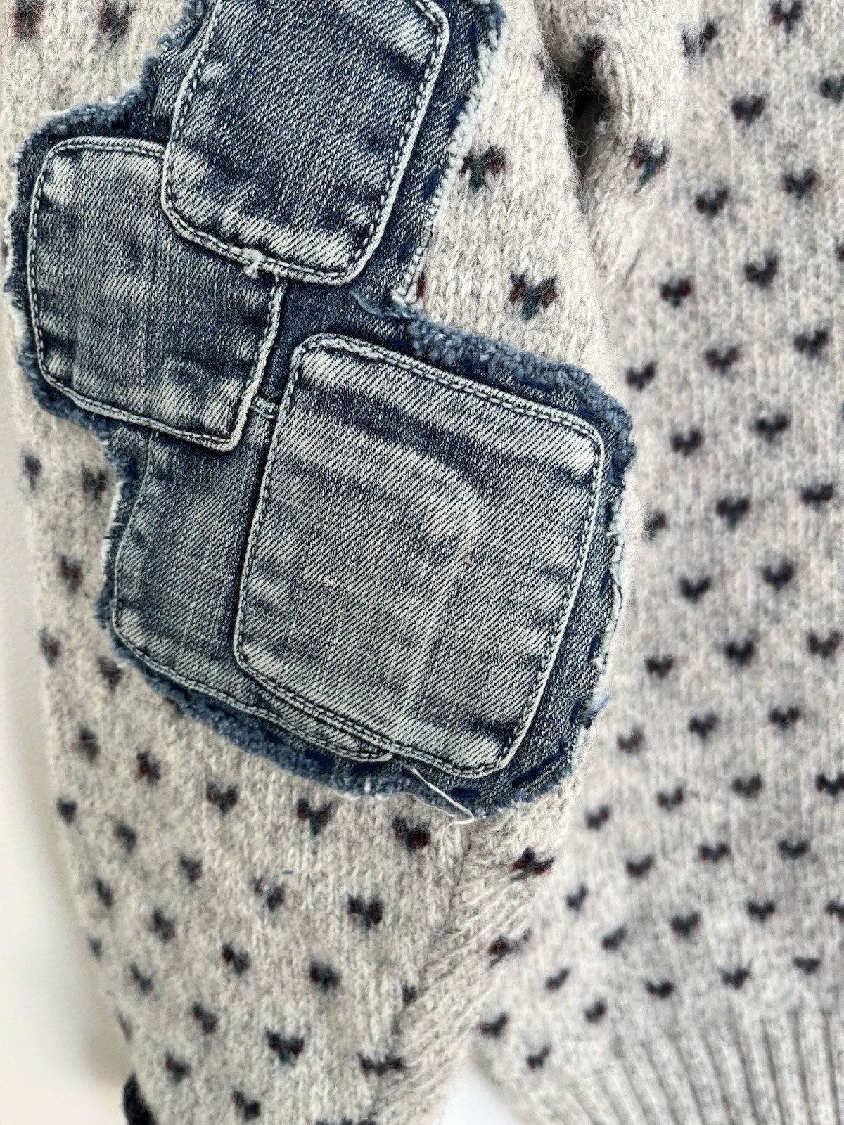 Upcycled ReStyled Grey Navy Denim Grunge Wool Size L Sweater OOAK Art To Wear