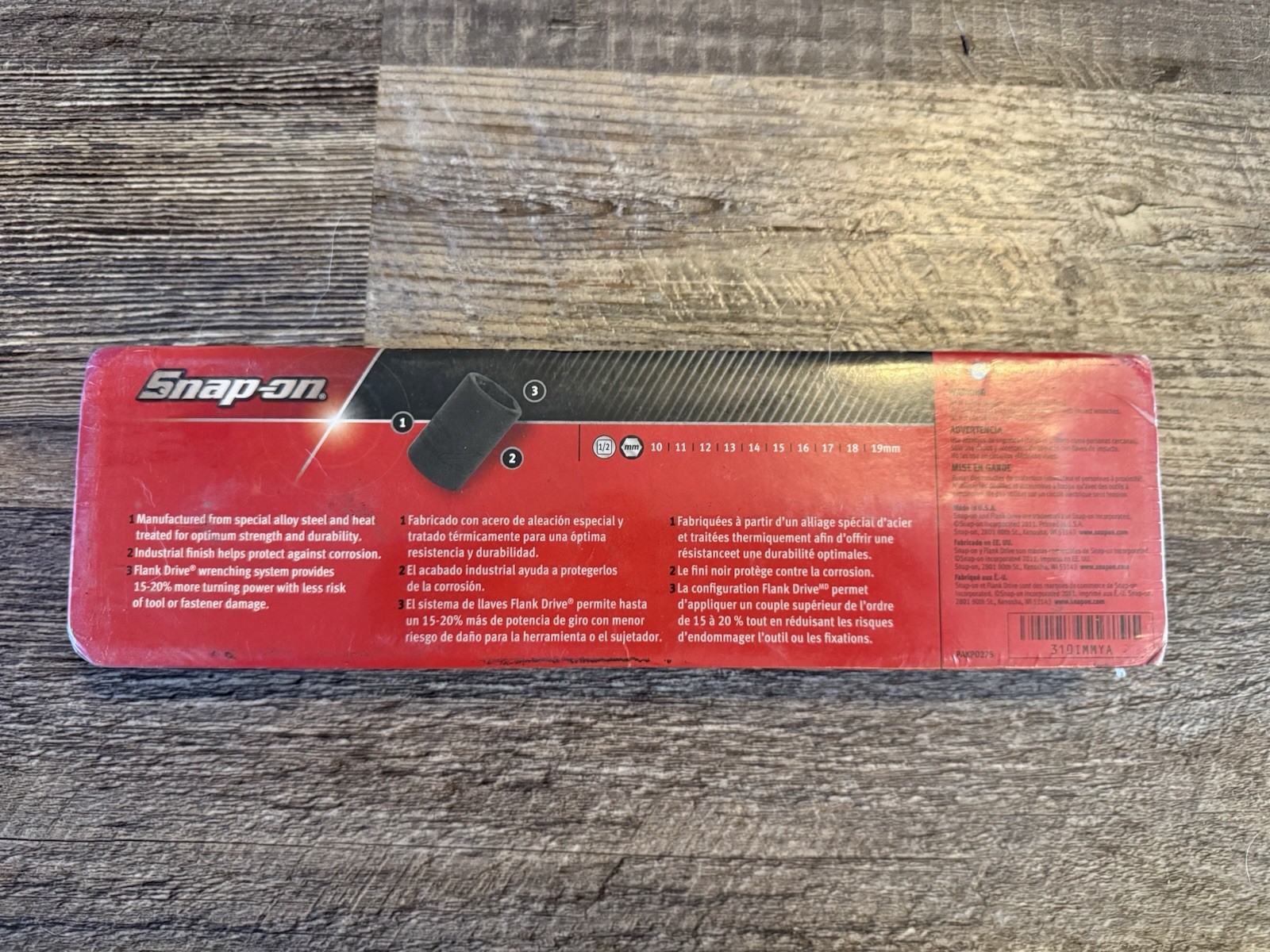 • Includes 10–19 mm sockets in a storage tray • Flank Drive® wrenching system delivers up to 20% more turning power without slipping or rounding while exceeding ANSI® performance standards • The hex depth of our impact sockets will start to thread the nut onto the stud; competitive sockets with a deeper hex require the user to start the nut by hand • Snap-on® impact sockets are heat treated to optimize impact service life with a lower hardness than hand sockets and are able to withstand repeated cycling loads of impact wrenches • Manufactured from the highest quality domestic steel, providing optimum strength, durability, and longer life • Square drive side hole works with ball- or pin-type retention • Industrial finish helps protect against corrosion