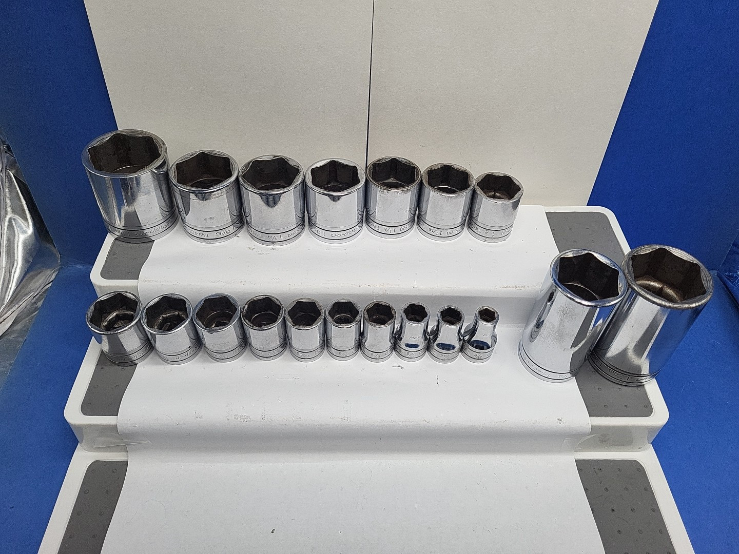 These are Snap-On Tools. The brand name speaks for itself in terms of quality and durability. TW 1 1/2 1 5/16 1 1/4 1 3/16 1 1/8 1 1/16 1 " 15/16 7/8 13/16 3/4 11/16 5/8 9/16 1/2 7/16 HAS CRACK 3/8. DEEP 1 7/16 1 1/4 All have use and wear. Some have wear from air guns and extensions. All are used. Some sockets have initials on them. See pictures. All have wear from use. All used and sold As-is.