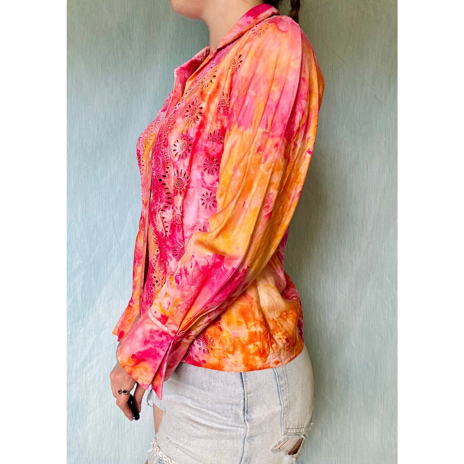 Expertly hand dyed cotton button up blouse featuring embroidery and cutwork. Permanent ice dyeing techniques in bright pink and orange enhance the floral designs of the shirt.