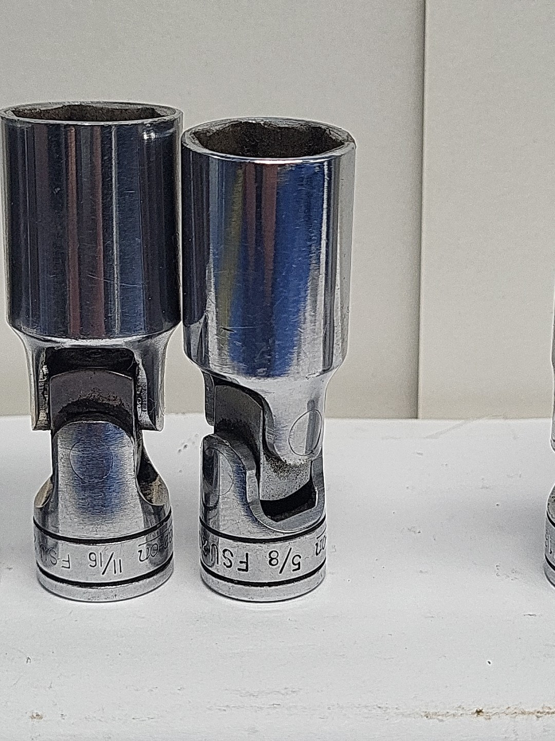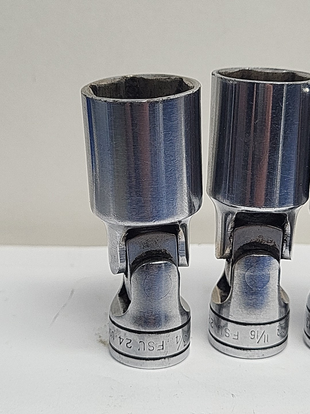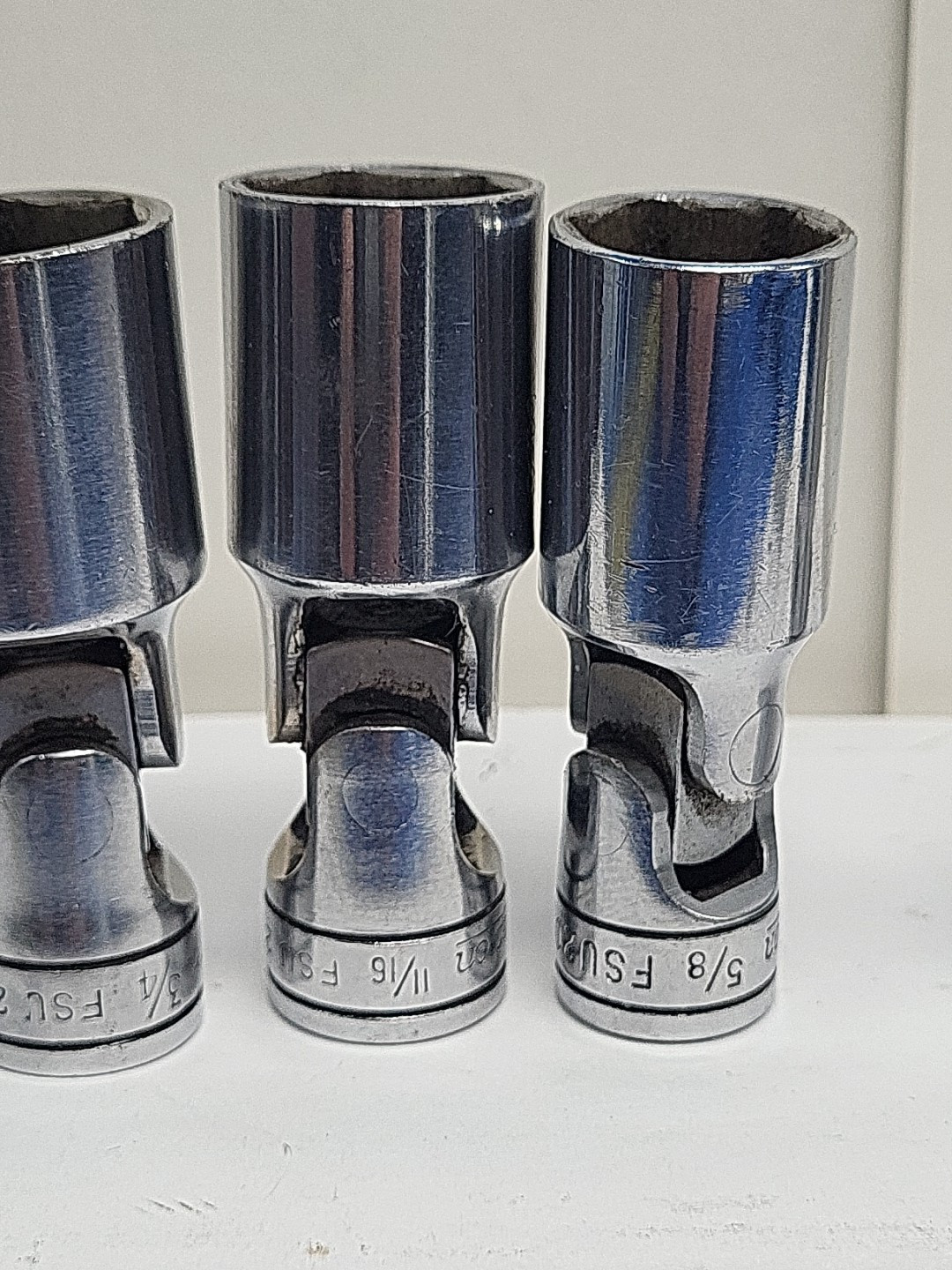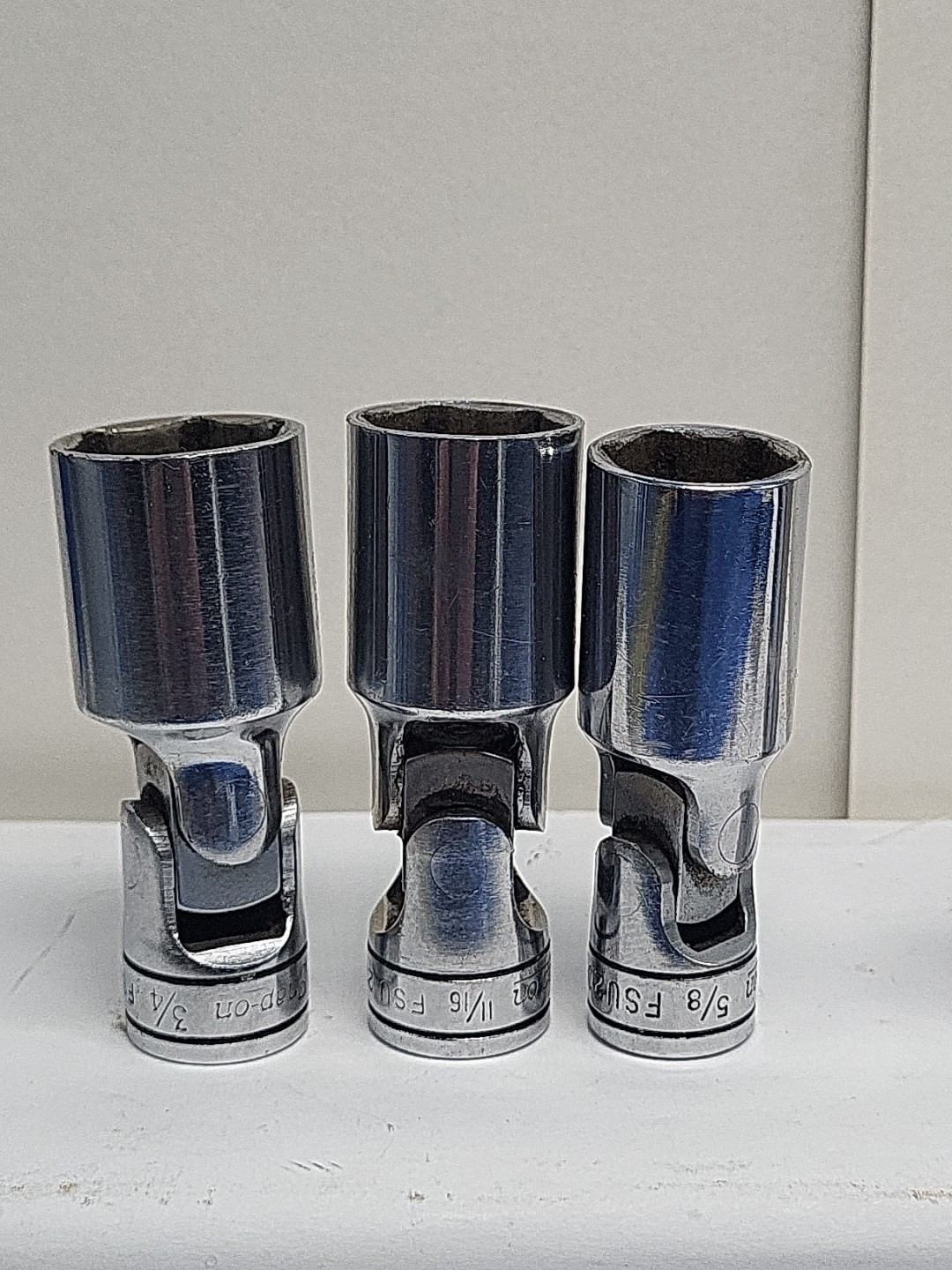 These are Snap-On sockets. The brand name speaks for itself in terms of quality and durability. 3/8 inch drive chrome .Some have wear from air guns and extensions. Chrome swivels FSU 3/4 11/16 5/8 NO 9/16 1/2 and 7/16. FS 20 5/8 and FU 9/16. Some of the sockets have initials on them. See pictures. All have wear from use. All used and sold As-is.