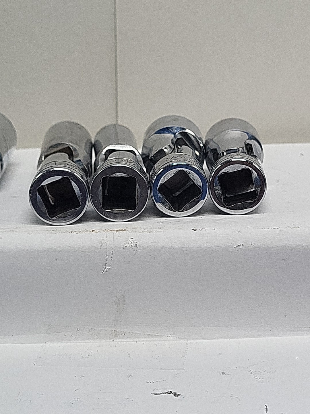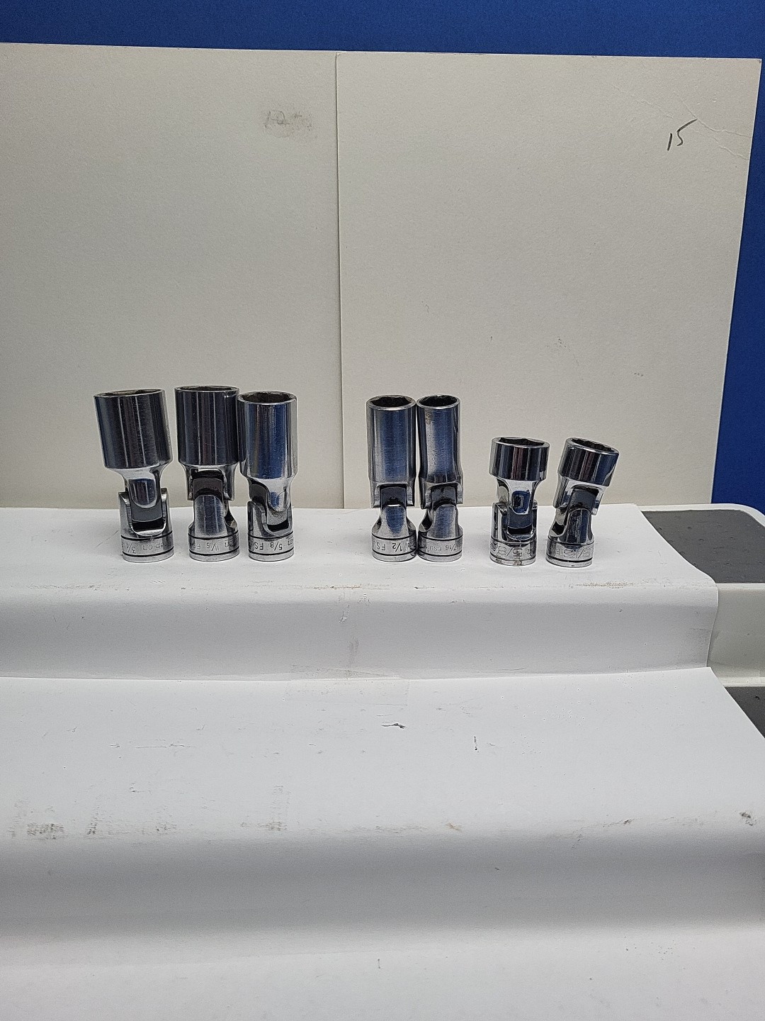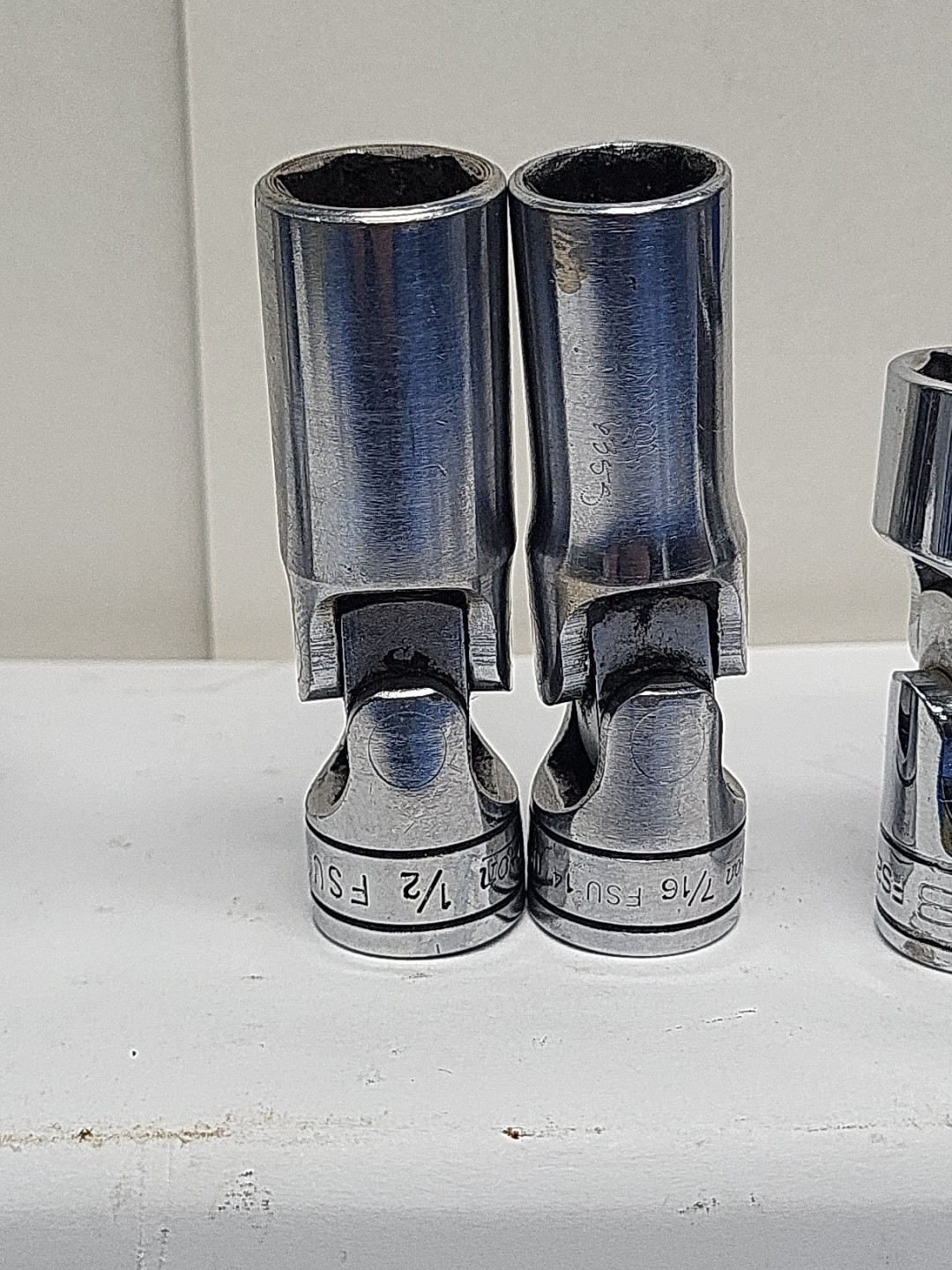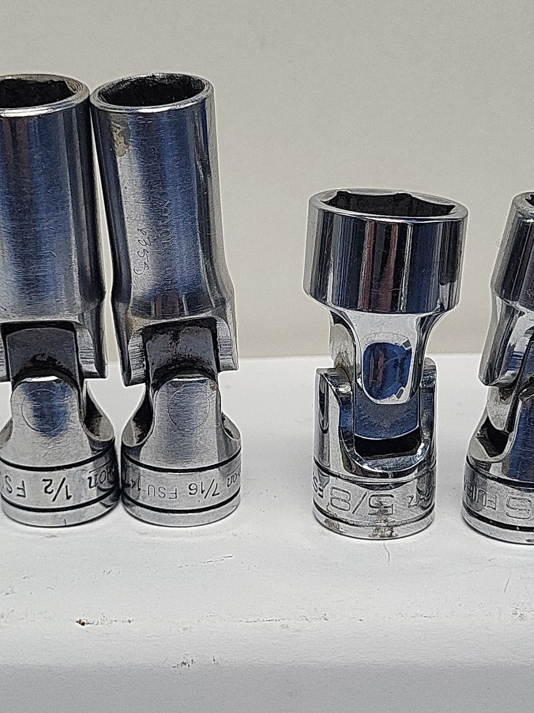 These are Snap-On sockets. The brand name speaks for itself in terms of quality and durability. 3/8 inch drive chrome .Some have wear from air guns and extensions. Chrome swivels FSU 3/4 11/16 5/8 NO 9/16 1/2 and 7/16. FS 20 5/8 and FU 9/16. Some of the sockets have initials on them. See pictures. All have wear from use. All used and sold As-is.