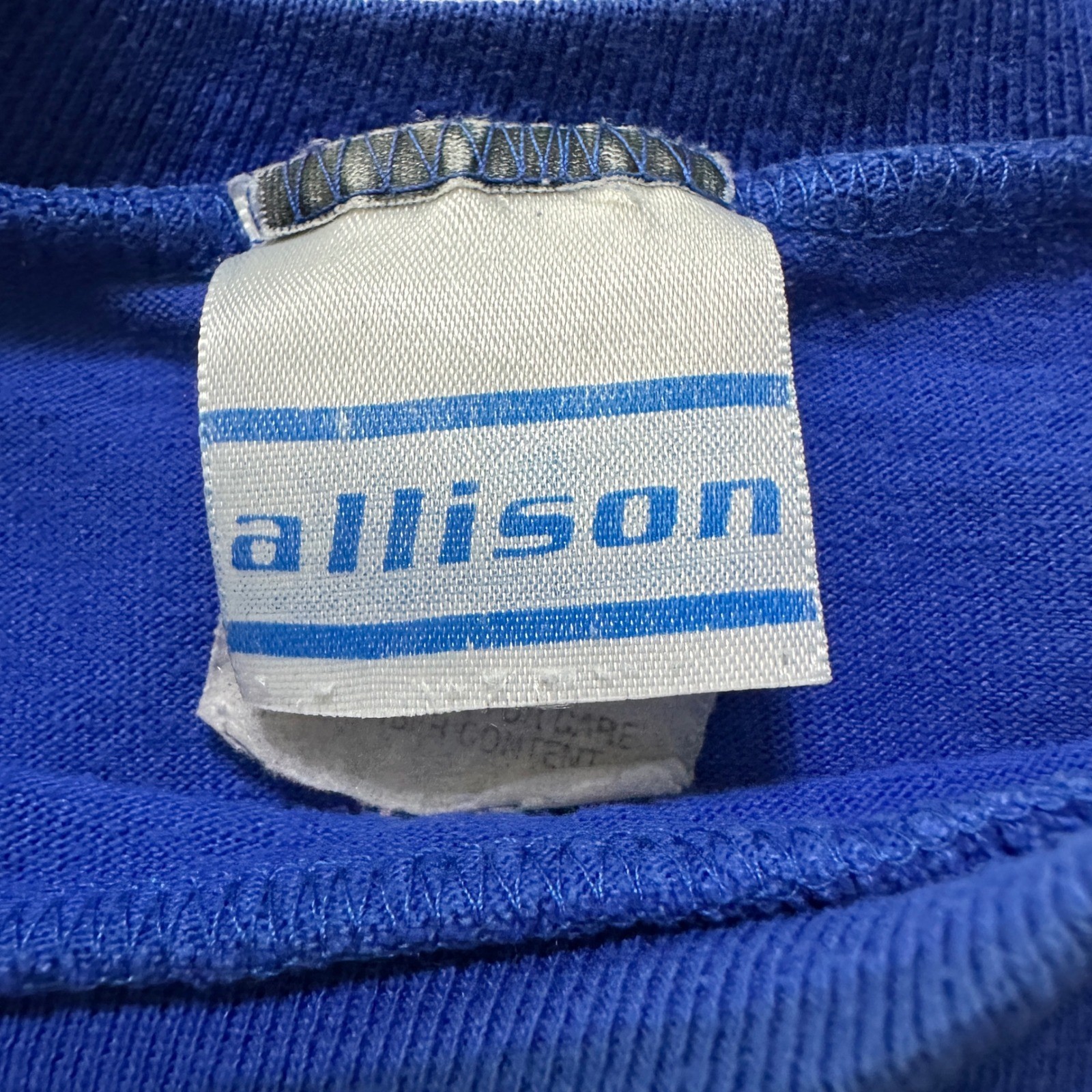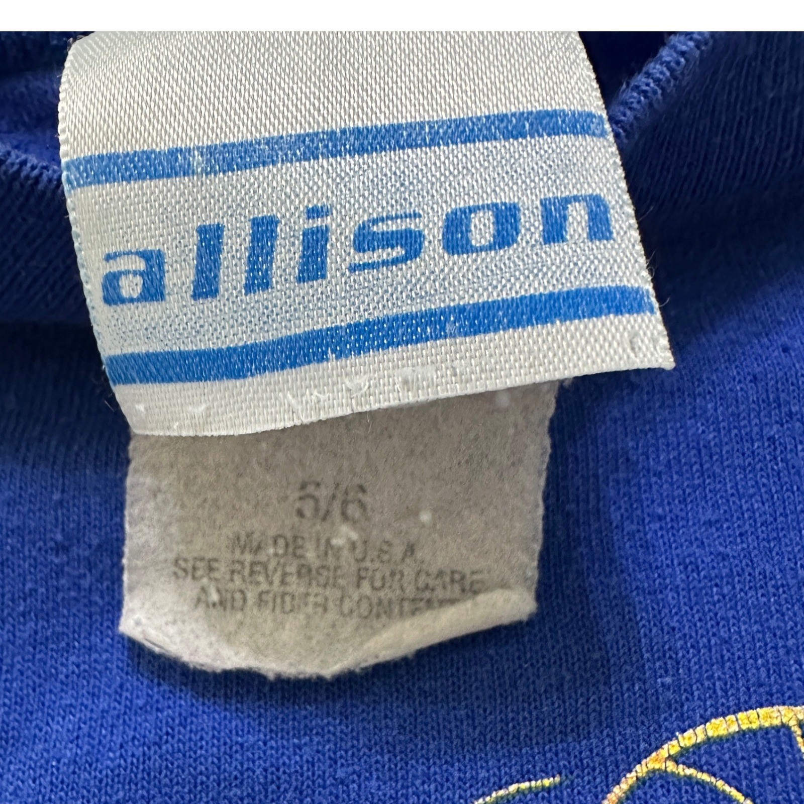 Vintage Allison Mickey Mouse basketball t-shirt features double-sided graphics of Mickey dunking and dribbling. This classic blue tee is crafted from a soft cotton blend and was made in the USA, showcasing a vibrant 90s-style aesthetic perfect for young Disney fans. The screen print has a slight intentional distressed look typical of vintage pieces.
