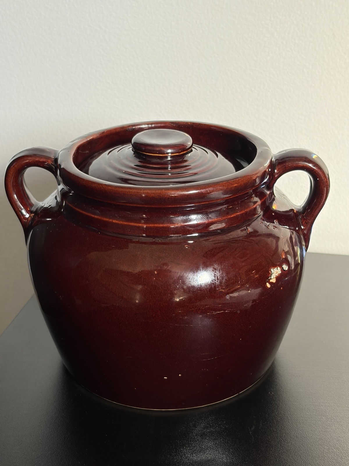 1900s Bean Pot Crock 2 Handle Antique Brown Stoneware w/ Lid Made in USA