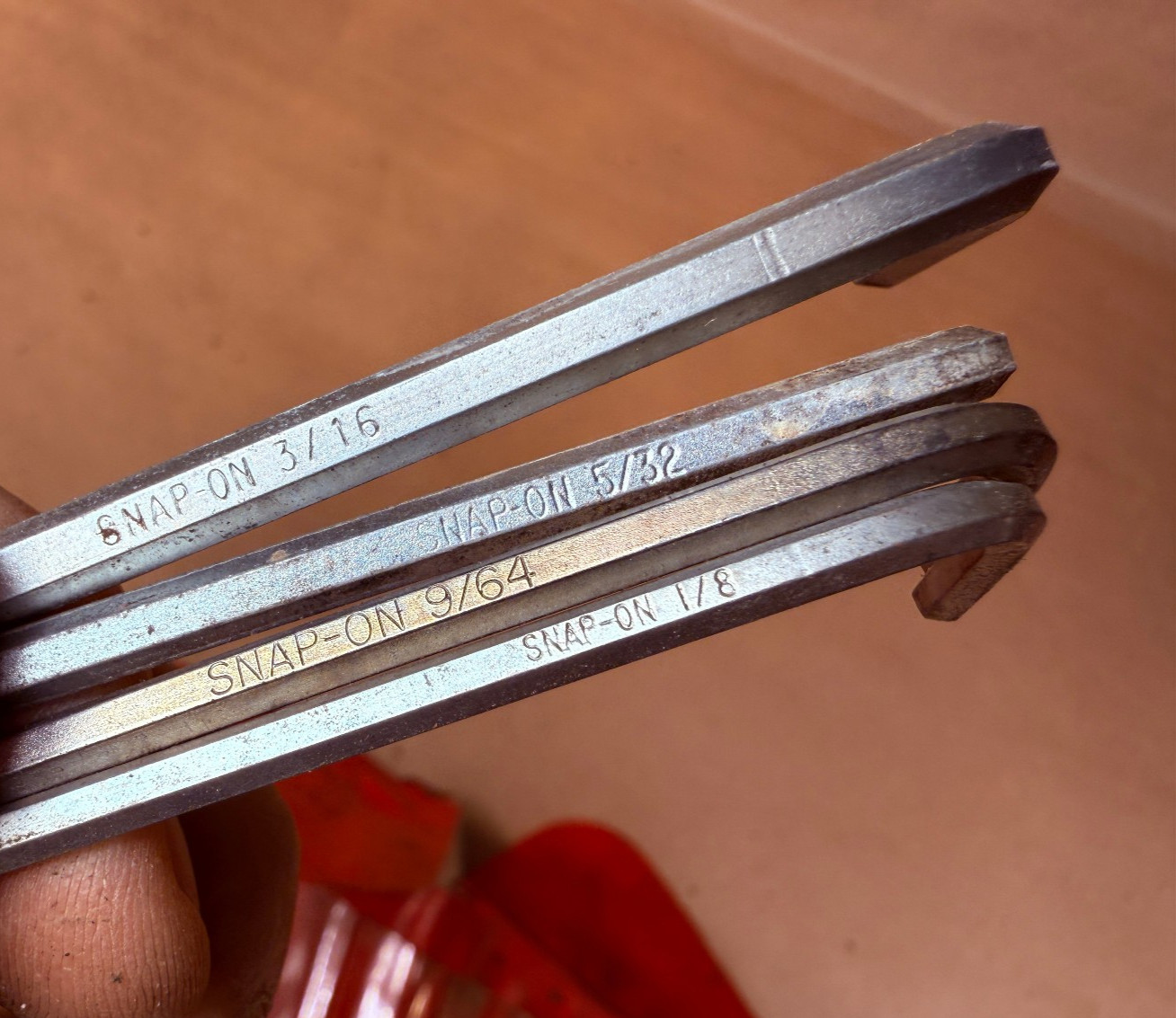 Free Shipping Snap-On Tools C-154 Hex Wrench Bit Set Allen Key 15 Pieces with Rough condition Pouch. Vintage set. Pouch is rough. Has burn mark and some of the flaps are torn. Some grime. Appears complete. 2 smallest black oxide finish have some rust. Some of the wrenches have script logo, others have All Caps. Below 7/64's, I didn't see markings. Not the prettiest, but ready to use, or maybe trade in?