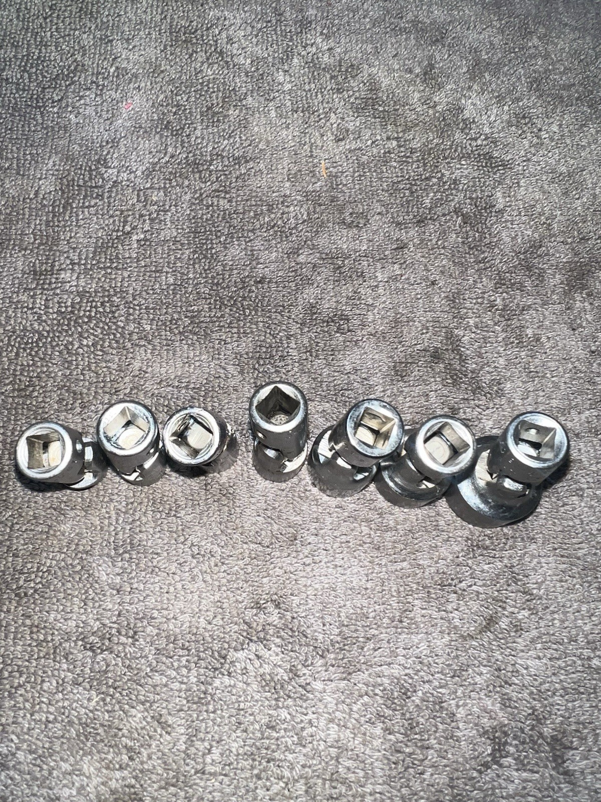 There is 7 used snap on swivel sockets all on working order . 9/16 Tmus 181 6point , 1/2 Tmus 161 6 point , 5/16 Tmu 101 12 point , 1/4 Tmus 81 6 point , 7/16 Tmus 141 6 point , 11/32 Mus 111 6 point , 9/32 Tmu 91 12 point .