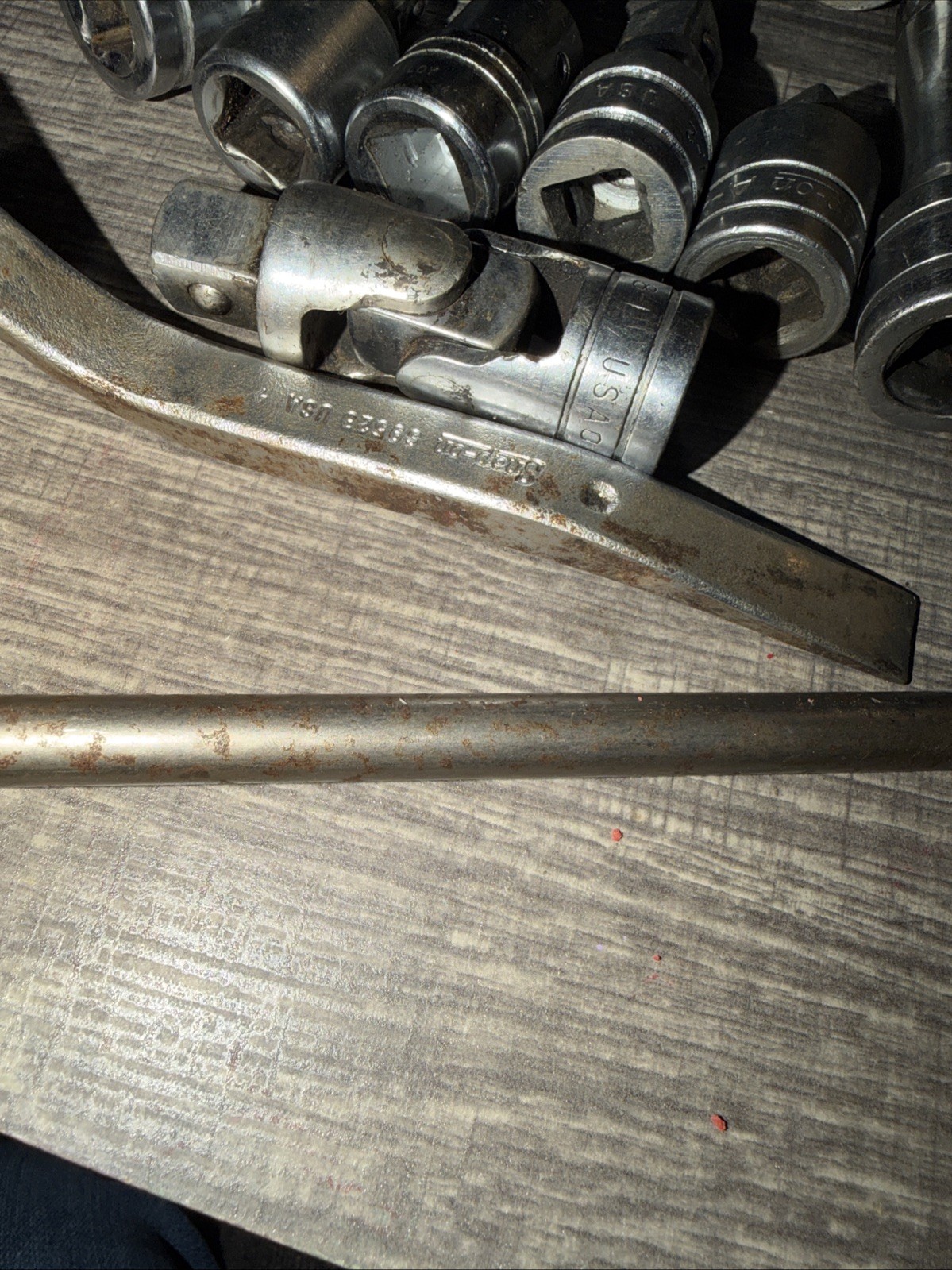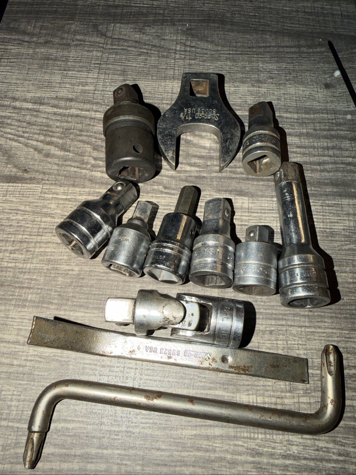 All of this stuff is used and working. You get Snap on one and 1/8 inch crowfoot stock number SC036. You get half inch impact swivel IP 80B. You get 3 inch extension SX3. You get an Armstrong 3/8 inch hex bit. That’s a bonus, not included in the piece count. You get a blue point double ended screwdriver. You get us Snap on S 9523 probably some kind of break tool. Haven’t swivel eight – L. Extension SX2. A half inch drive Ratchet two 3/8 inch drive socket adapter number AIMF. Extension SX2. Extension SX2. And another snap on half inch Ratchet to 3/8 inch adapter 8–4. Oh, and all that is 10 pieces of snap on, one piece of blue point, and one piece of Armstrong.