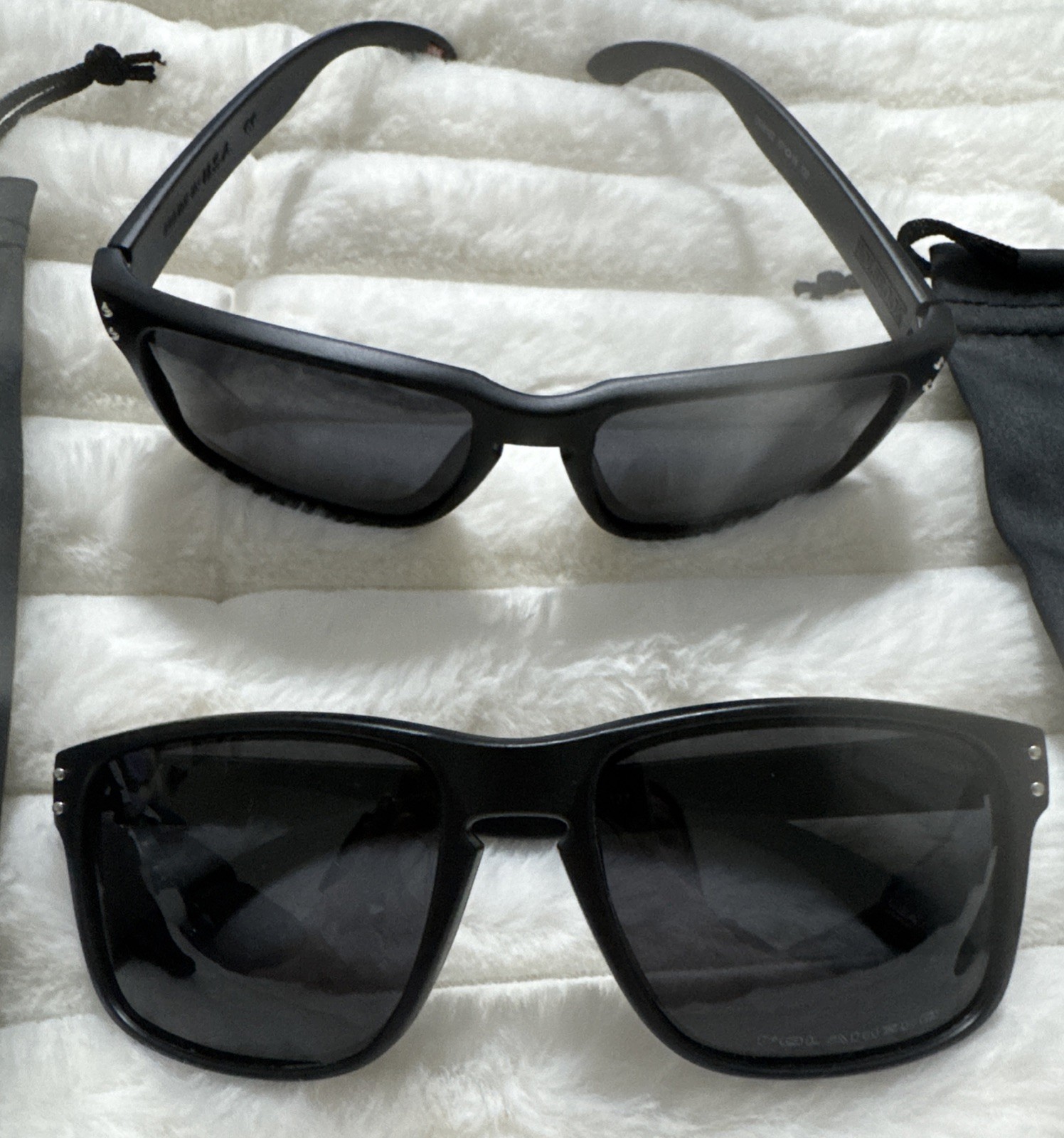 2 pairs of Oakley Holbrook like style polarized black sunglasses, made in the USA. These sunglasses feature a rectangle shape with a frame width of 140mm and a frame color of black. The lenses are tinted and polarized, offering UV400 protection.