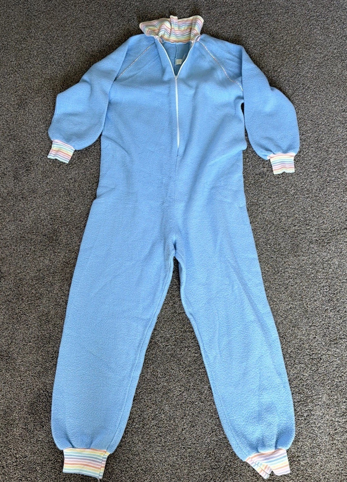 Light blue with rainbow cuffs and collar. Vintage Sears JR. Bazaar brand big kids size large blanket sleeper. See measurements, since this could fit a small adult or teen. This may have been sold in Junior Women's.