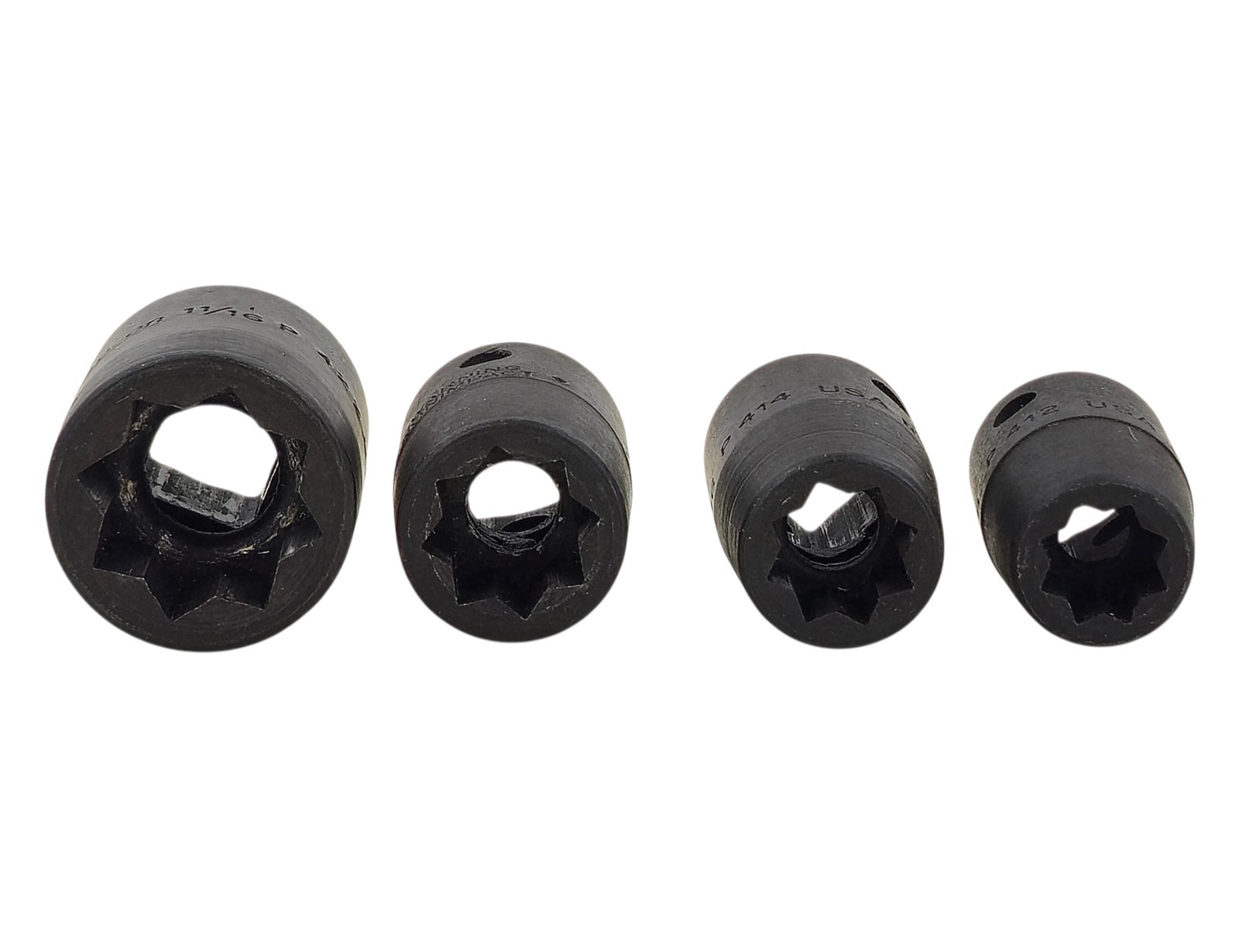 They all show signs of use, but there is no rusting or pitting. Socket sizes included are 1" (P432), 7/8" (P428), 3/4" (P424), 11/16" (P422), 1/2" (P416), 7/16" (414), and 3/8" (P412). They are all marked "warning non impact".