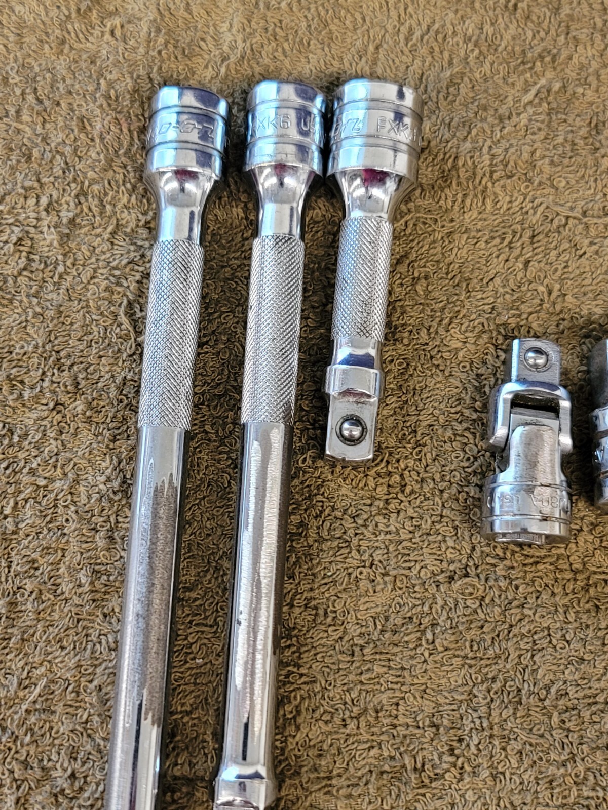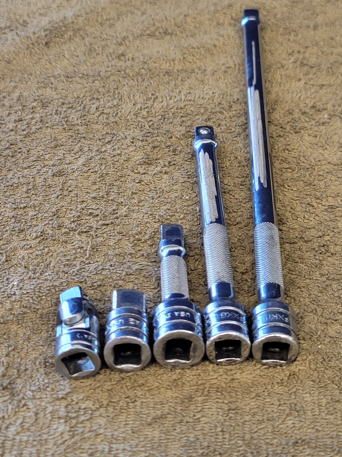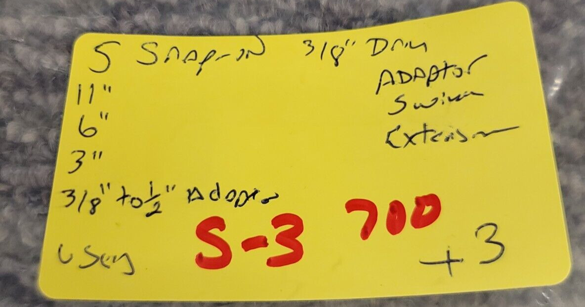 For sale are 5 used Snap-on 3/8" Drive Extensions/Universal Swivel/Adapter. The extensions are FXK 11 6 3" The swivel is 3/8" FU8A. The adapter is 3/8" to 1/2" A2. The sizes/Quantities are written on the yellow tag in the photos. You will get all 5 as shown with your order. This is military surplus and may have marking on the tools as shown. The Please view all photos. You will get EVERYTHING you see in the photos with your purchase.