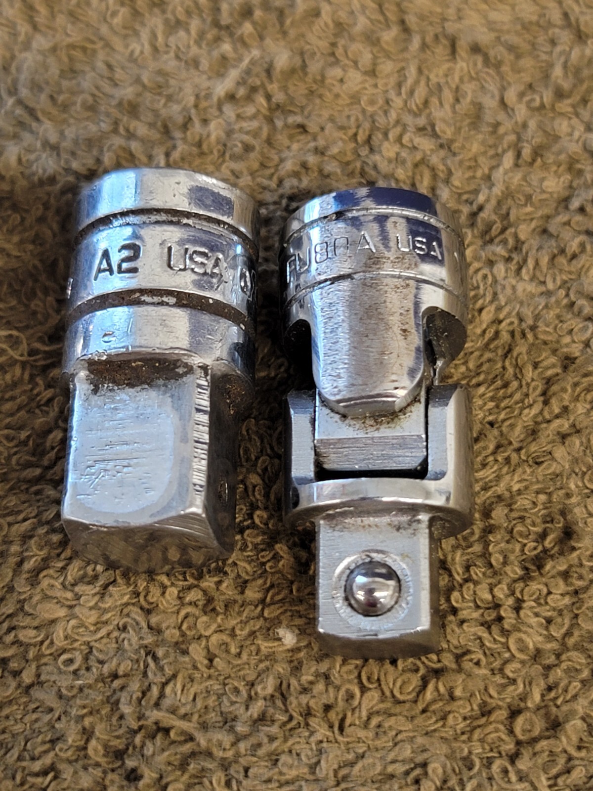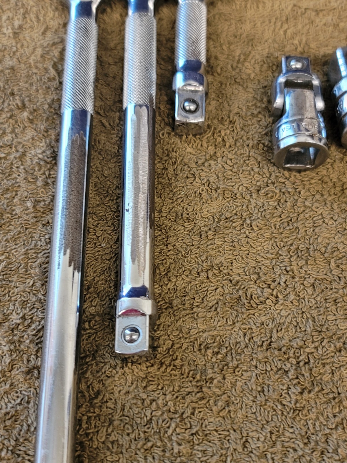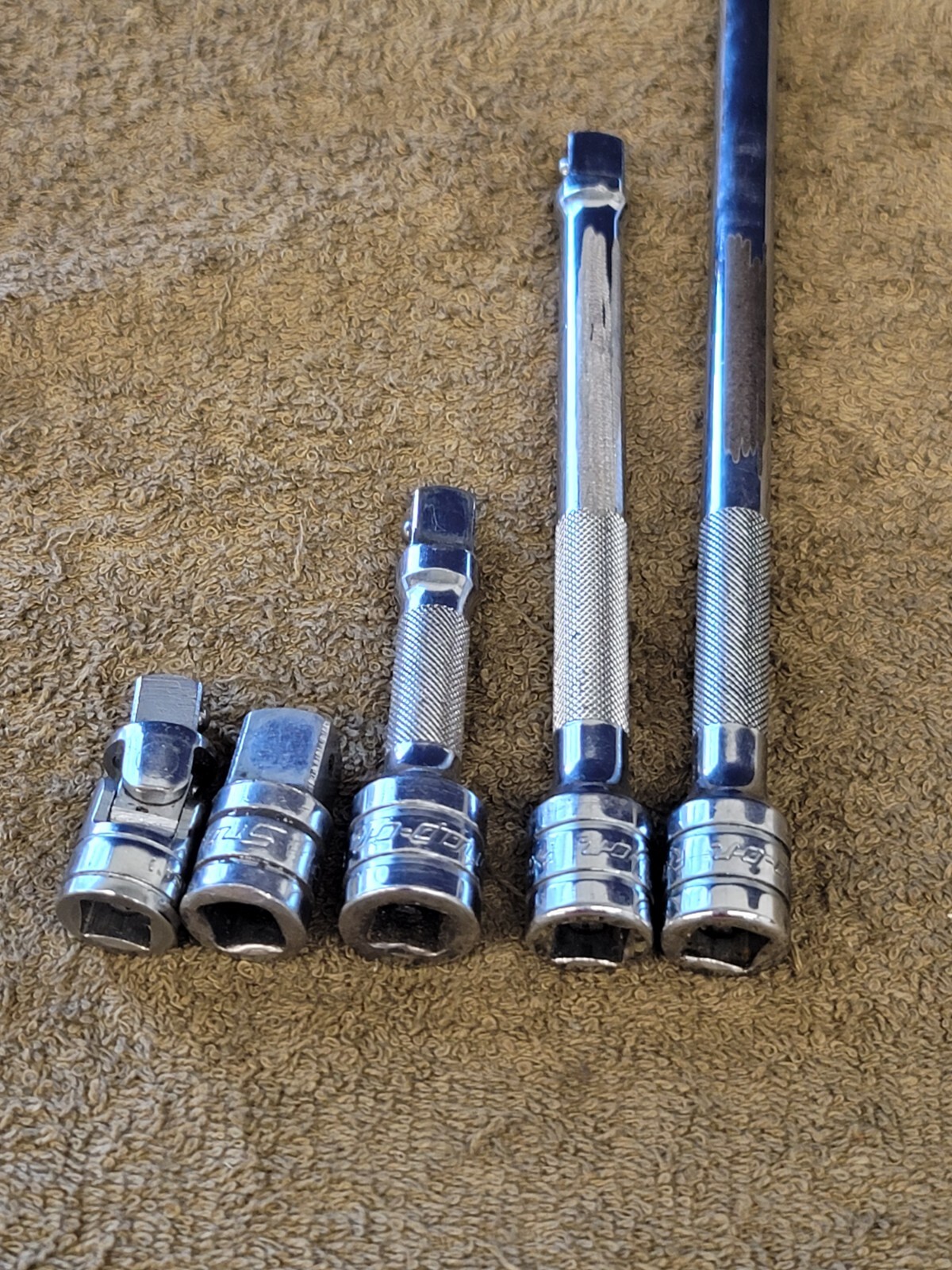For sale are 5 used Snap-on 3/8" Drive Extensions/Universal Swivel/Adapter. The extensions are FXK 11 6 3" The swivel is 3/8" FU8A. The adapter is 3/8" to 1/2" A2. The sizes/Quantities are written on the yellow tag in the photos. You will get all 5 as shown with your order. This is military surplus and may have marking on the tools as shown. The Please view all photos. You will get EVERYTHING you see in the photos with your purchase.