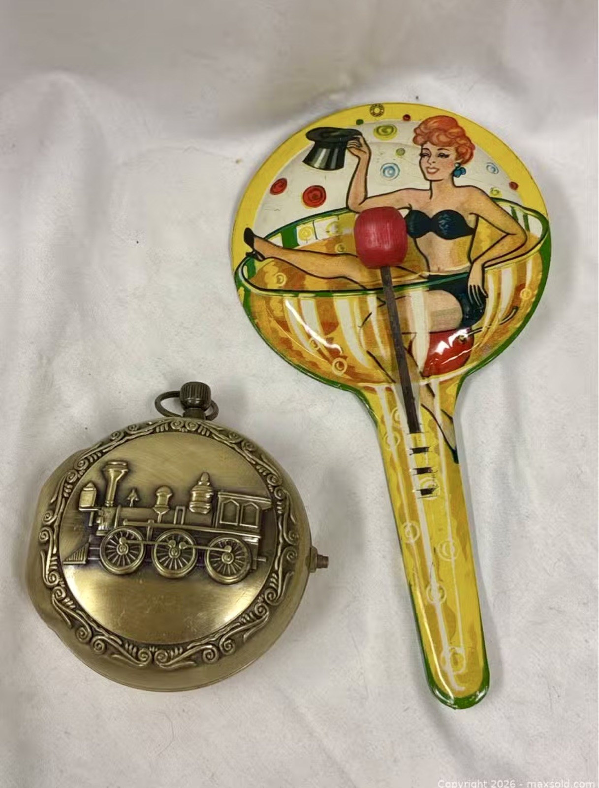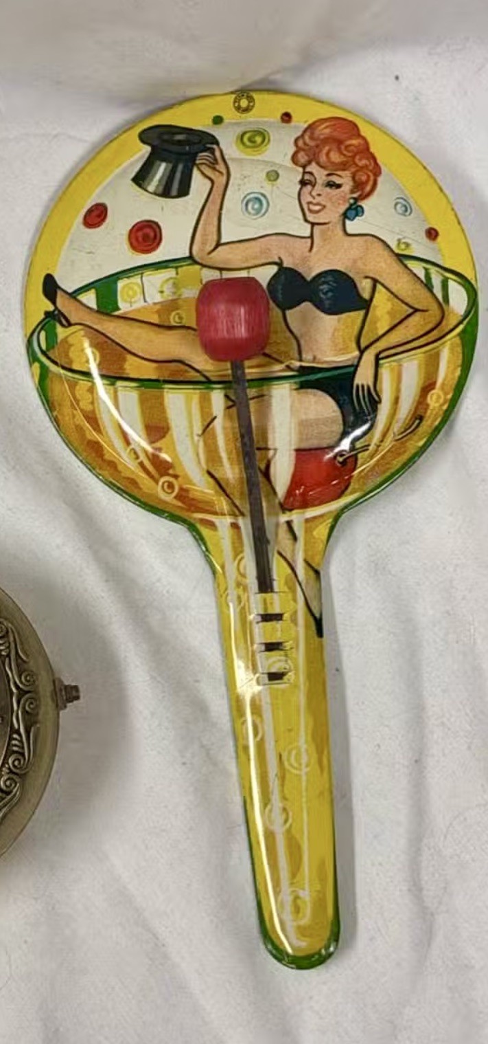 The product is a vintage 1950 tin die-cast toy representing a woman in a champagne noise-themed design. Made by U.S. Metal Toy Mfg. Co., this toy is a unique collectible piece with a retro charm. The tin material adds to its vintage appeal, making it a valuable addition to any collection of vintage and antique toys. Made in the USA, this toy showcases a piece of nostalgia from the mid-20th century.
