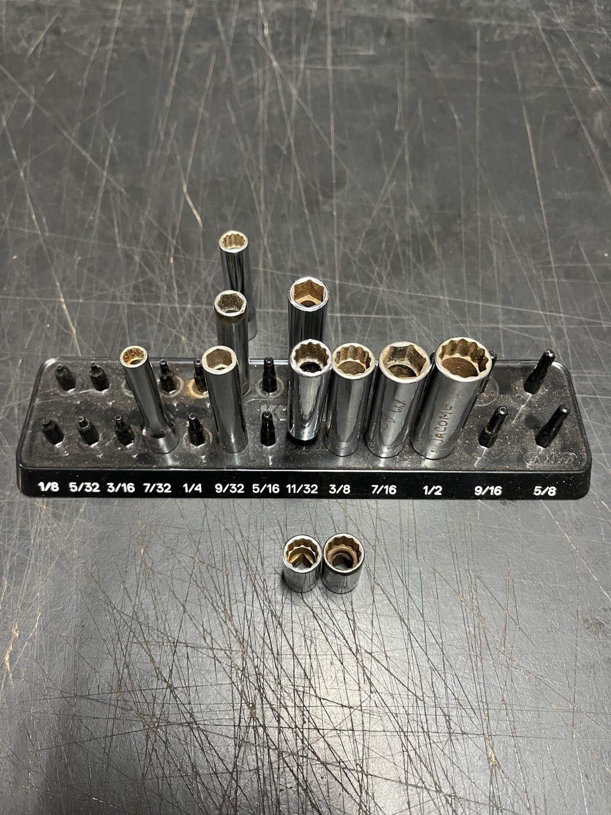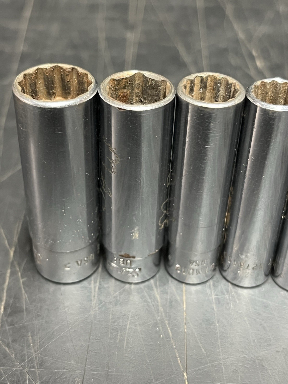 They are used and show wear but all of them will function as they should. All of these sockets either have an owners name etched in them or they have another mark or chrome chipping on them. I posted a picture of them on an organizer so you can see the sizes. There are multiple of the same sizes of some of them. Please see photos for condition