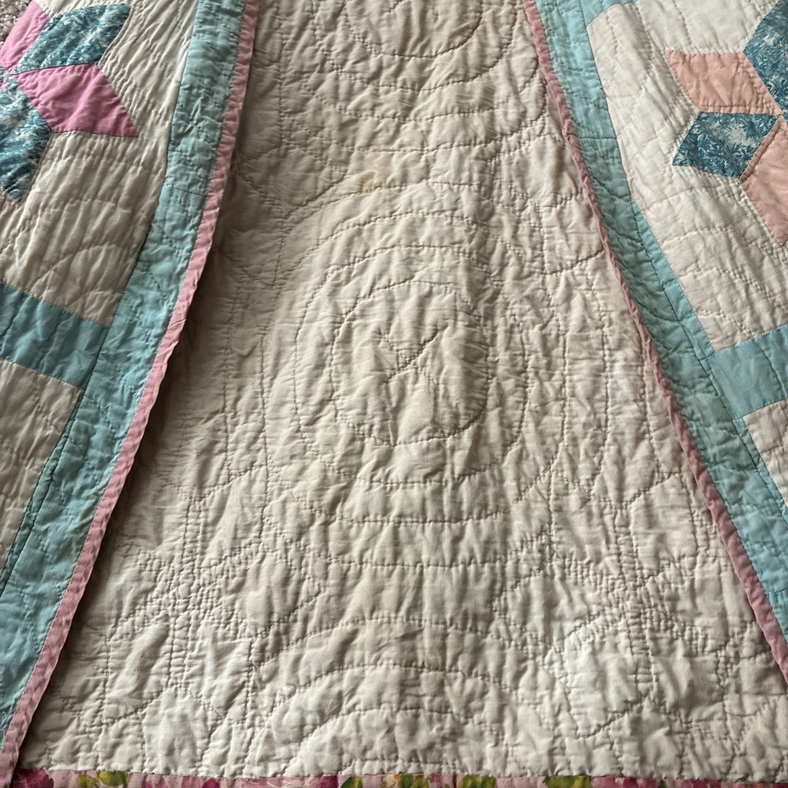 This handmade, tea stained, upcycled quilt jacket coat features a unique blue and pink patchwork design with star motifs, perfect for a casual oversized fit. Made from vintage quilt fabric, this mid-length jacket is ideal for women who appreciate handmade, one-of-a-kind pieces. The distressed styling and oversized fit give it a very BOHO, free spirited, cottagecore look. Please note that any spots or blemishes that you see on the coat are from the tea stain distressing.