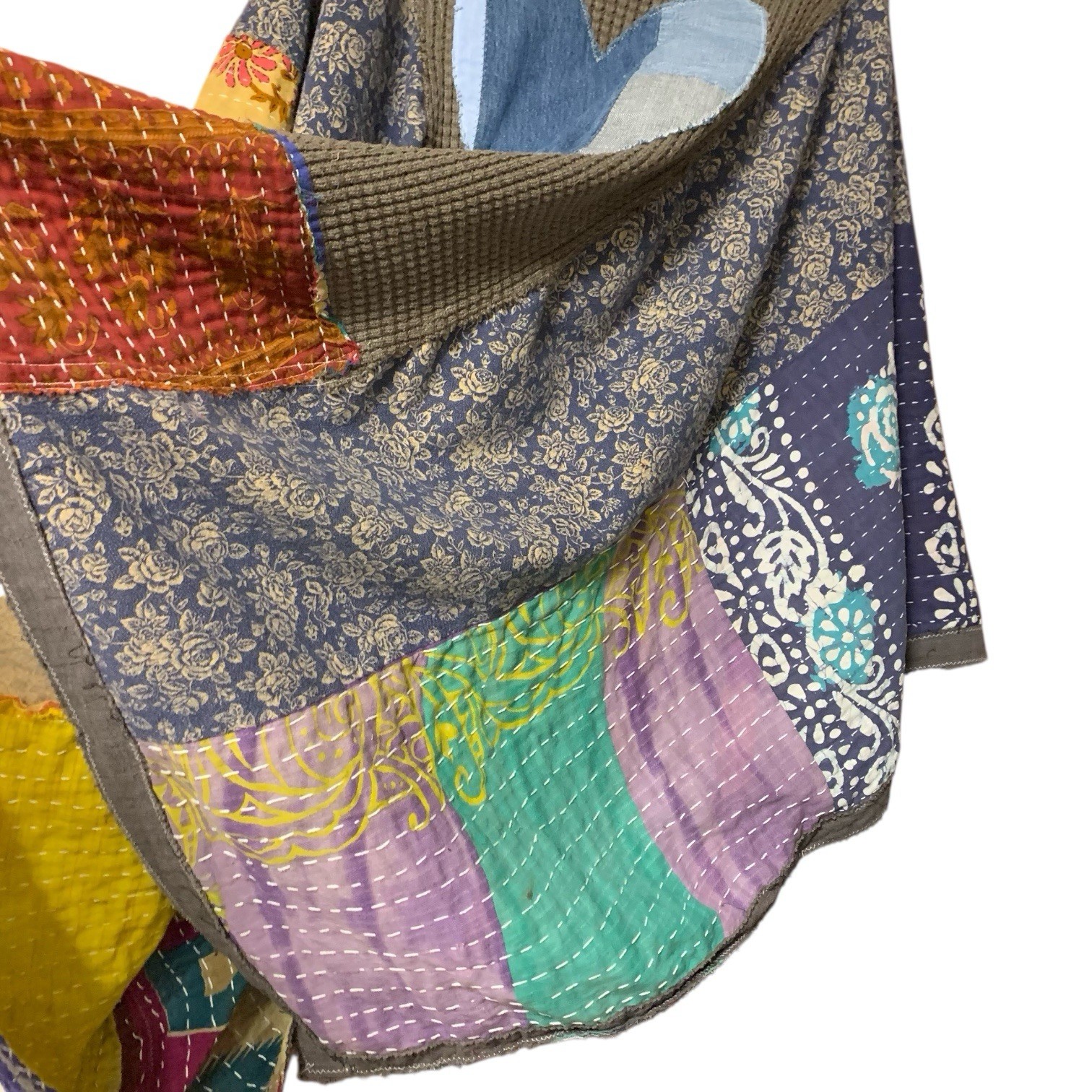 Upcycled using a cotton sweater, denim patchwork, kantha and other random fabrics from my stash.
