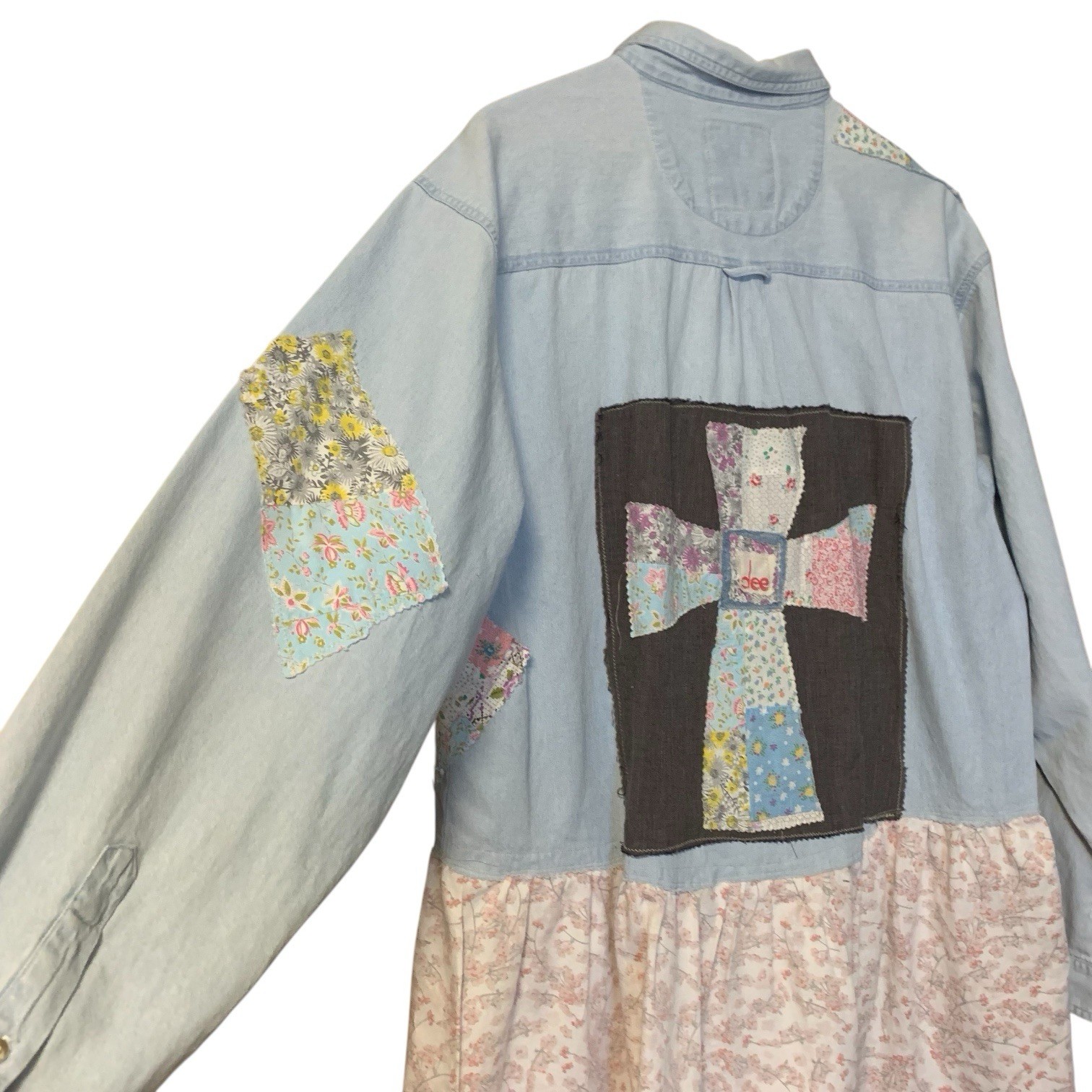 Upcycled Tunic Top XL Denim Patchwork Cross Art To Wear Gypsy Eco Boho Relaxed