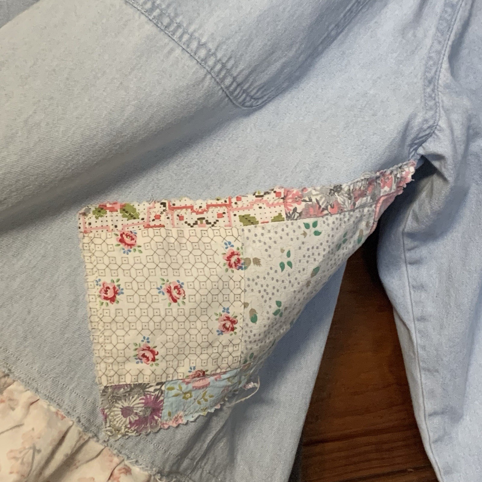 Collared denim shirt with contrasting cotton flannel hem.