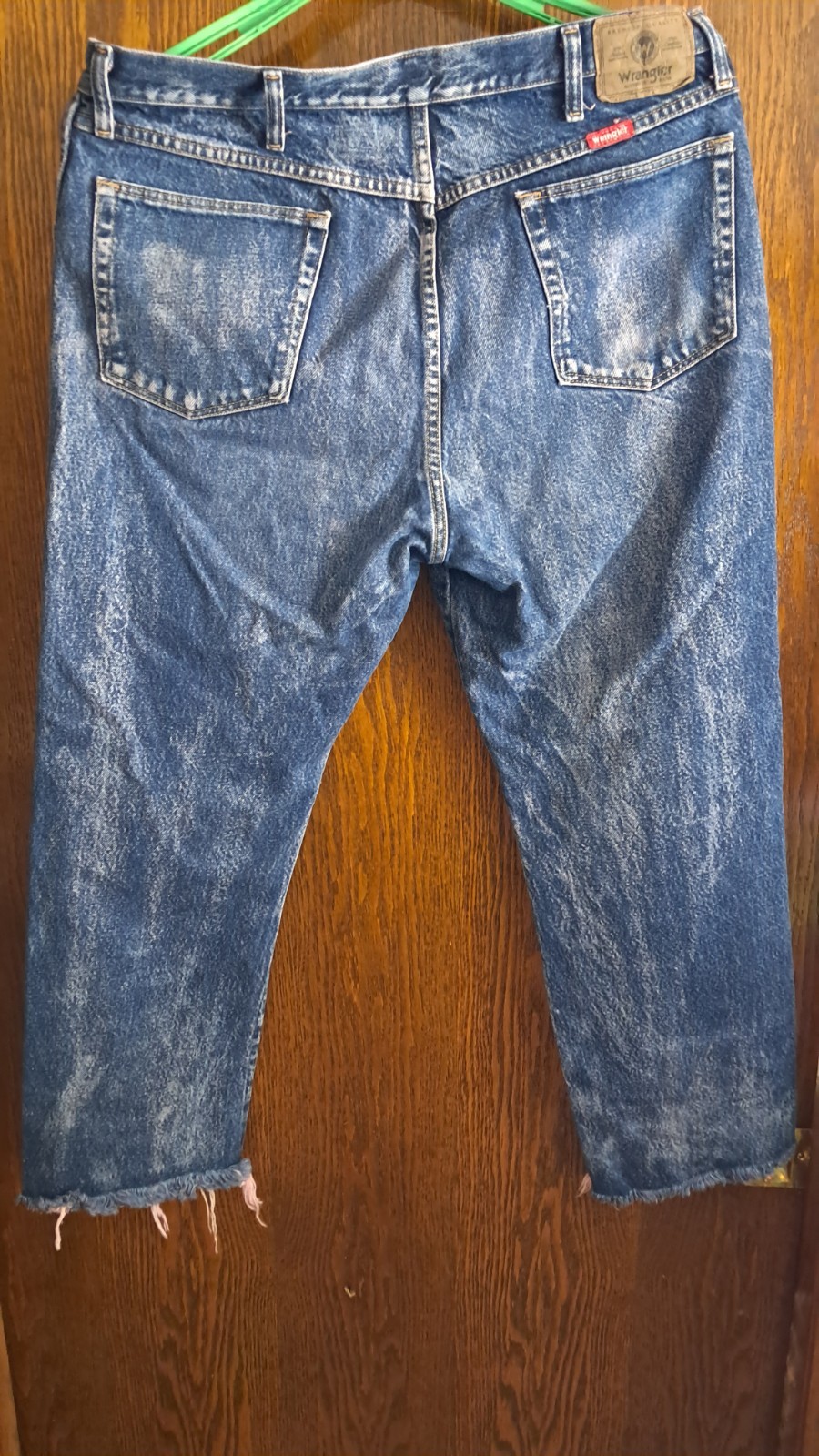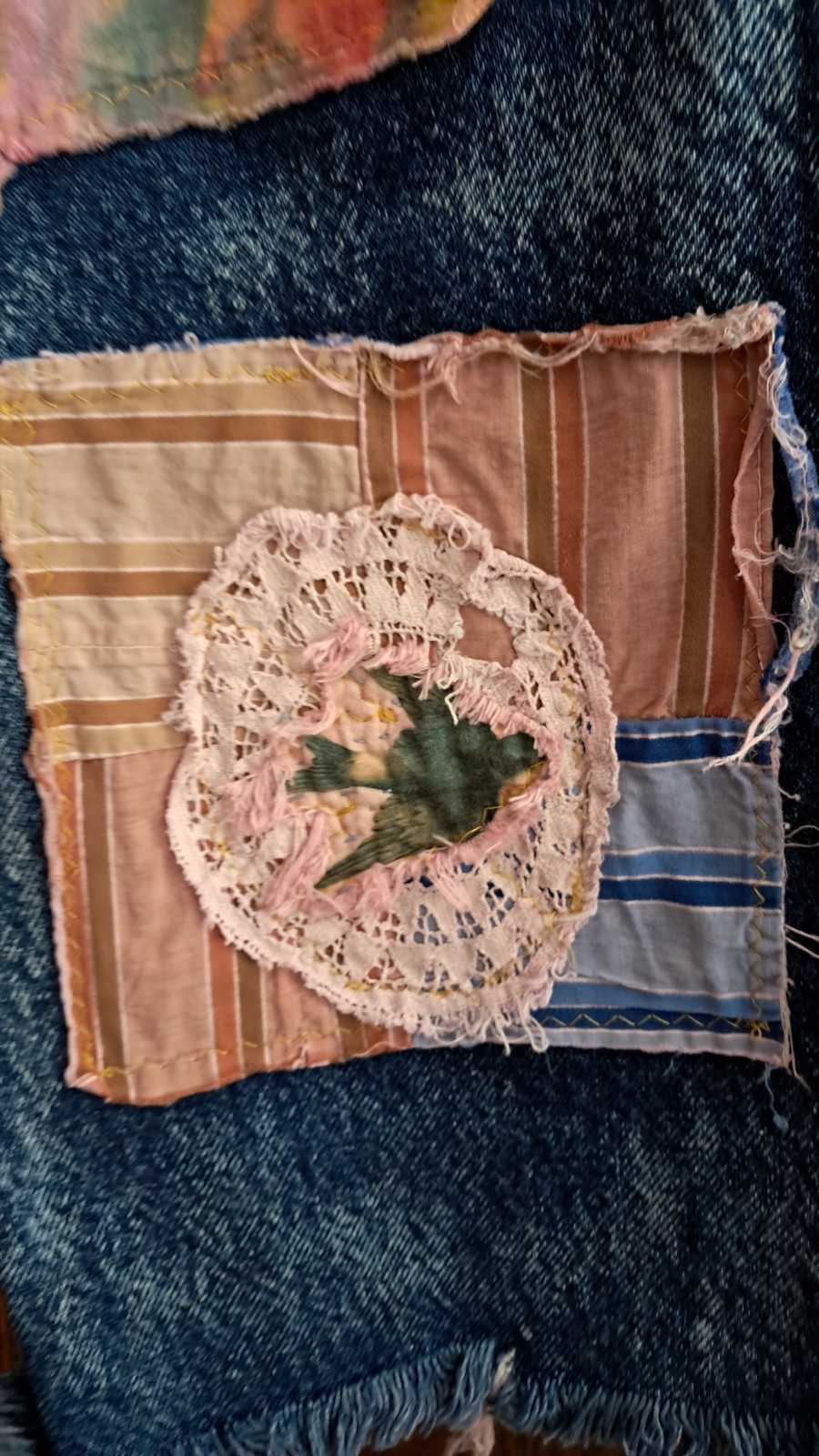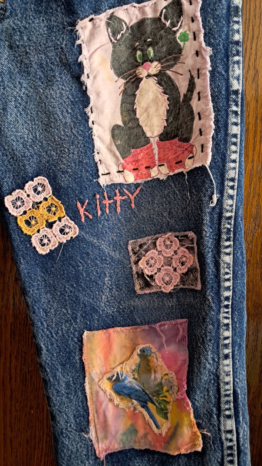 Upcycled Wrangler jeans 100% cotton ,distressed and embellished with custom appliques.