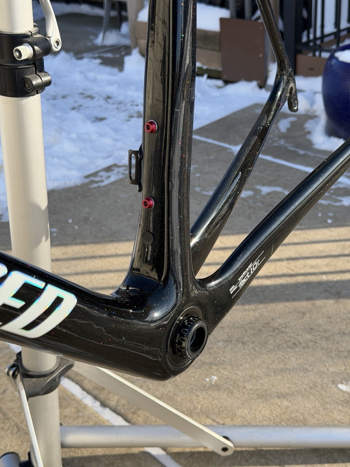 Tarmac 2018 SL5 Fact Carbon 10R Use but Well Taken Care Check The Pictures the Paint Has a Cool Affect Very Unique this Frame is Threaded Bottom Bracket It Comes With Dura Ace 9100 Bottom Bracket, also a Bottom Carbon Cap, SWorks Carbon Sit Post, Head Set and Stem All Bearings are Good Including Bottom Bracket about 400 Mls Only Domestic Shipping No Returns, got Questions Ask please Thanks for looking