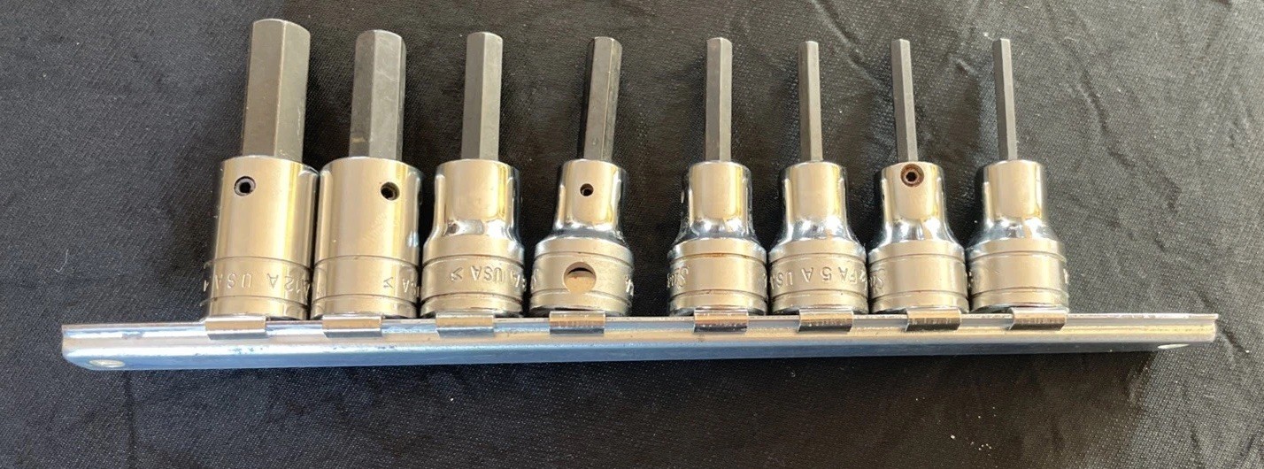 Set includes: FA 4A 1/8"; FA 4A.5 9/64"; FA 5A 5/32"; FA 6A 3/16"; FA 7A 7/32"; FA 8A 1/4"; FA 10B 5\16"; FA 12A 3/8"; and the socket rail with 7 clips.