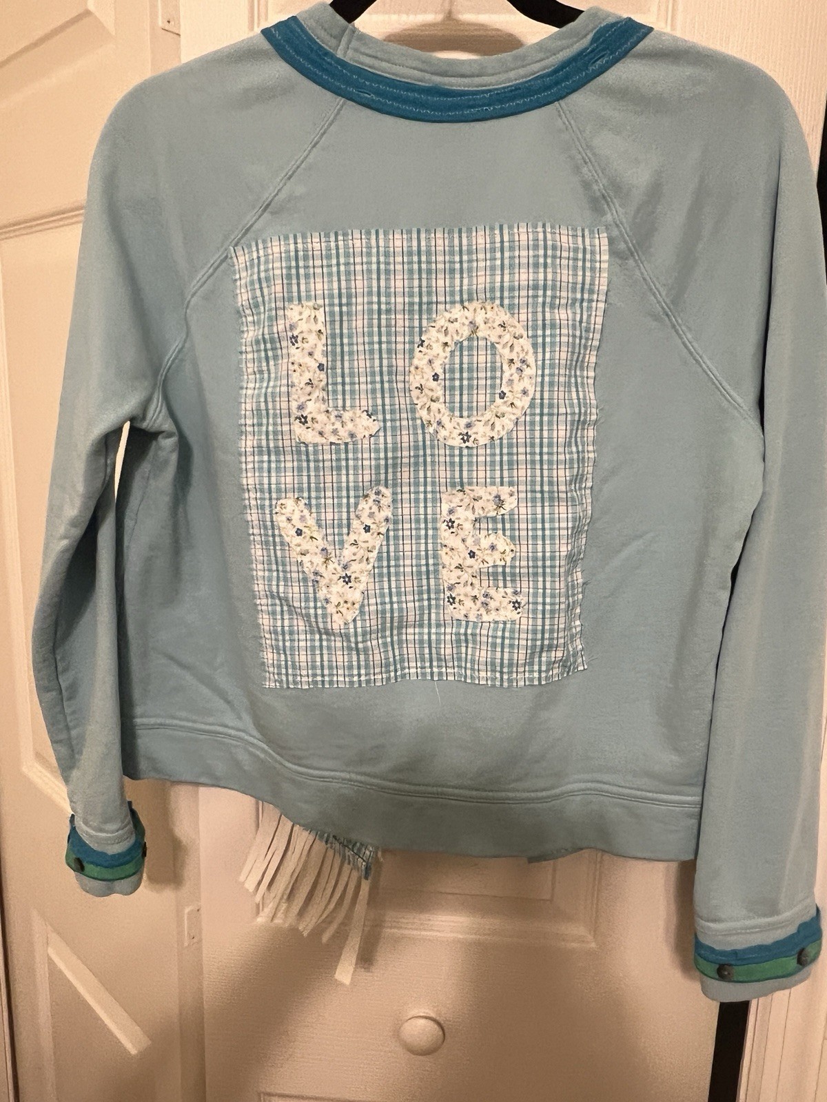 The product is a blue sweater that has been upcycled to fit size small. It is designed for women and falls under the category of women's clothing. The blue color adds a stylish touch to the sweater, making it a versatile piece for any wardrobe. Measures pit to pit 21” sleeves 26” length 21”. One of a kind open front.
