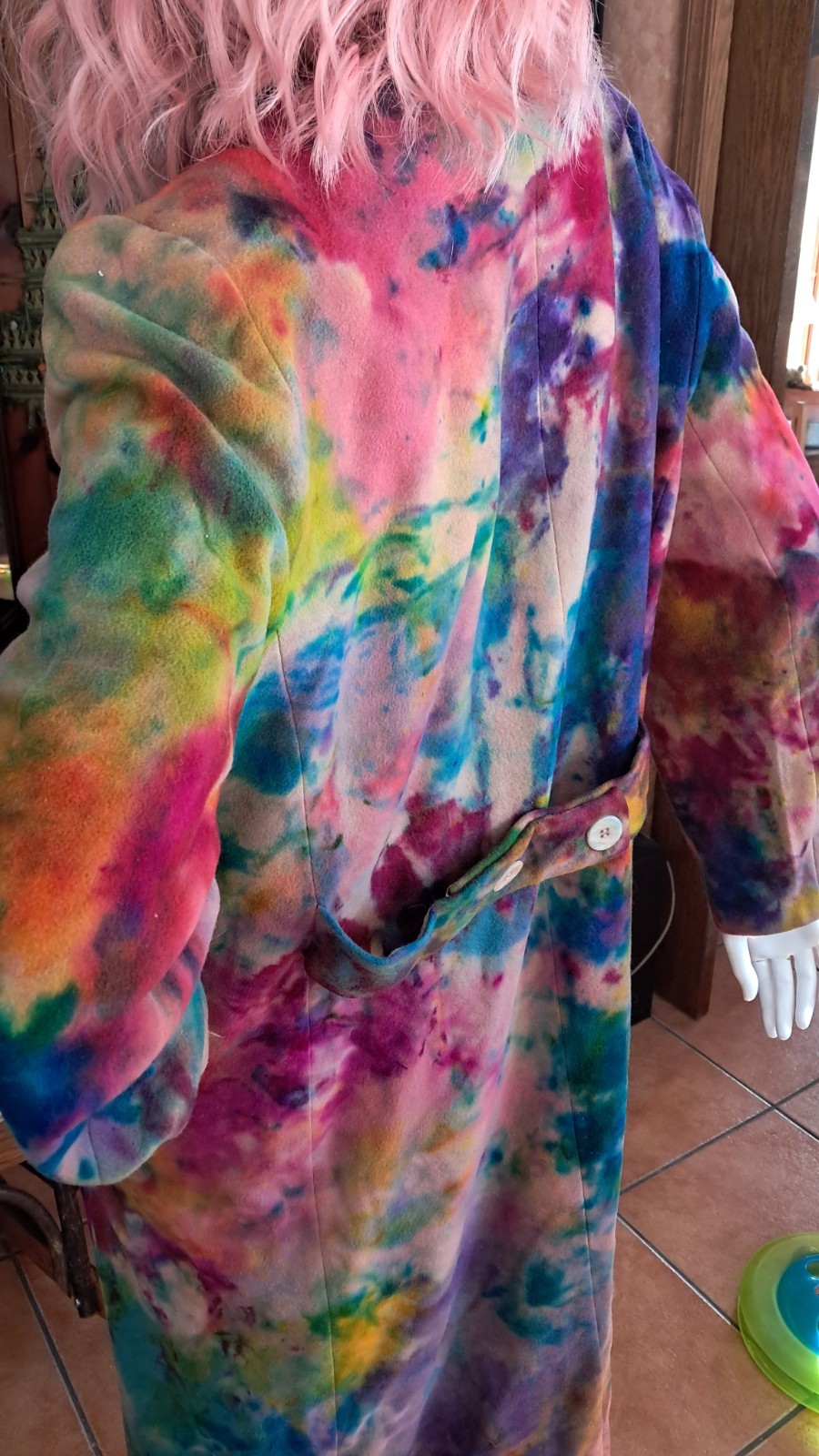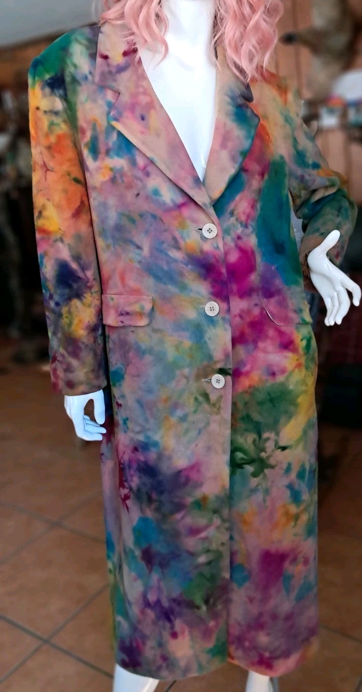OOAK Upcycled 100% Wool (90 wool,10 cashmere) hand dyed for tie dye rainbow effect trench coat.