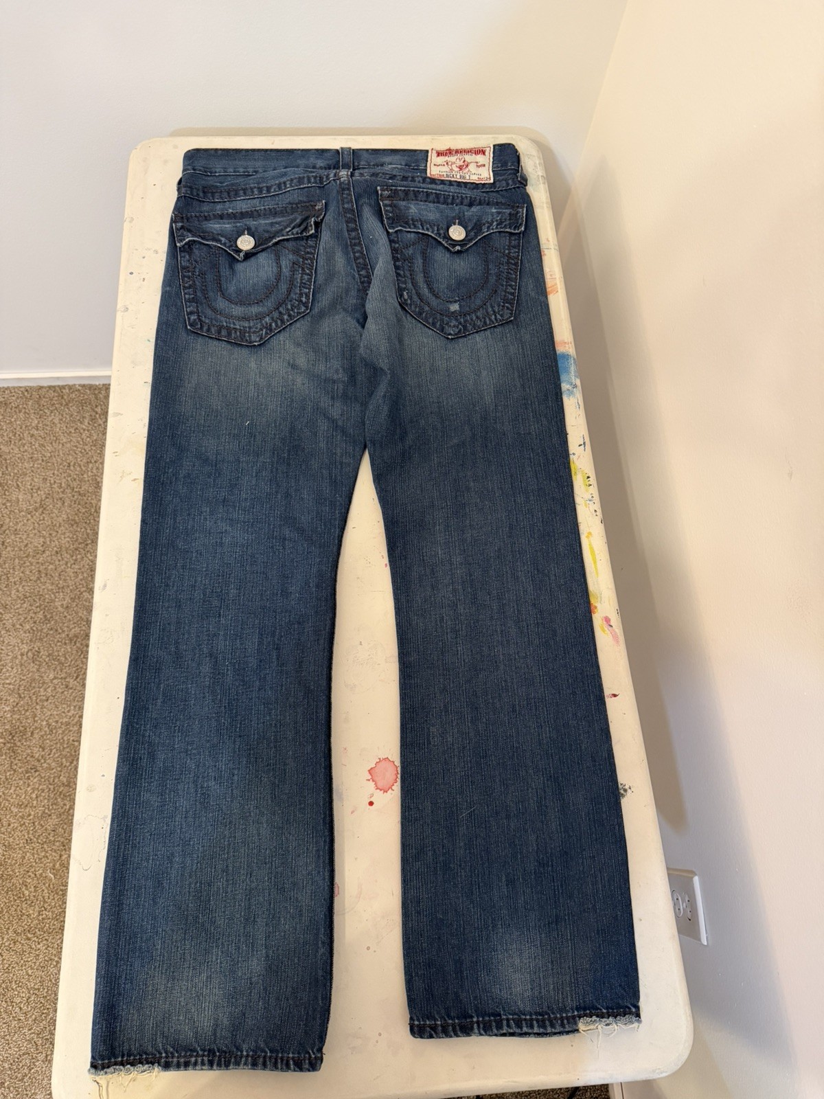 The TRUE RELIGION Ricky Big T Men's Jeans in size 34x34 are a stylish and high-quality pair of denim pants. Made in the USA with distressed detailing, these jeans feature a zipper fly closure and thick white/navy pick stitching accents. The mid-rise fit and relaxed straight leg style offer comfort and a classic look. The 5-pocket design, horseshoe pockets, and dark wash add to the overall appeal of these designer jeans suitable for fall season wear. Waist is a 36 but fit a bit smaller. Check measurements.