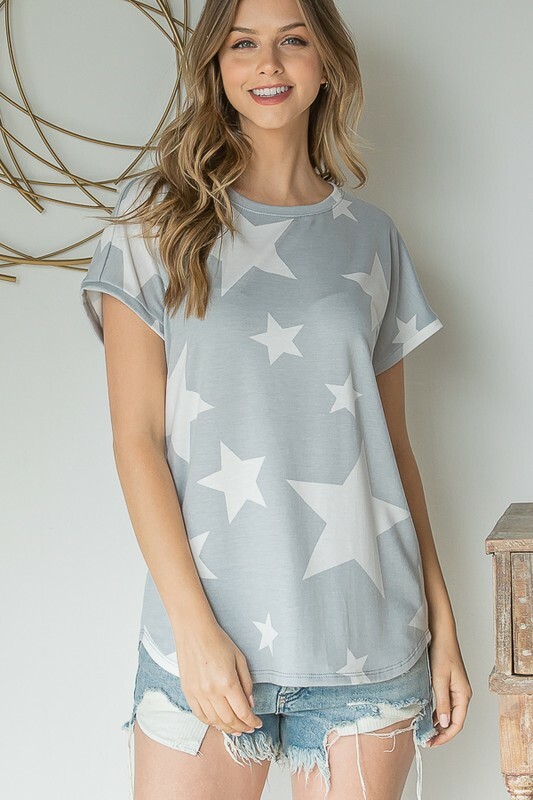 Women's Blue/Grey Star Print Short Sleeve Round Neckline Top (Made In U.S.A.)