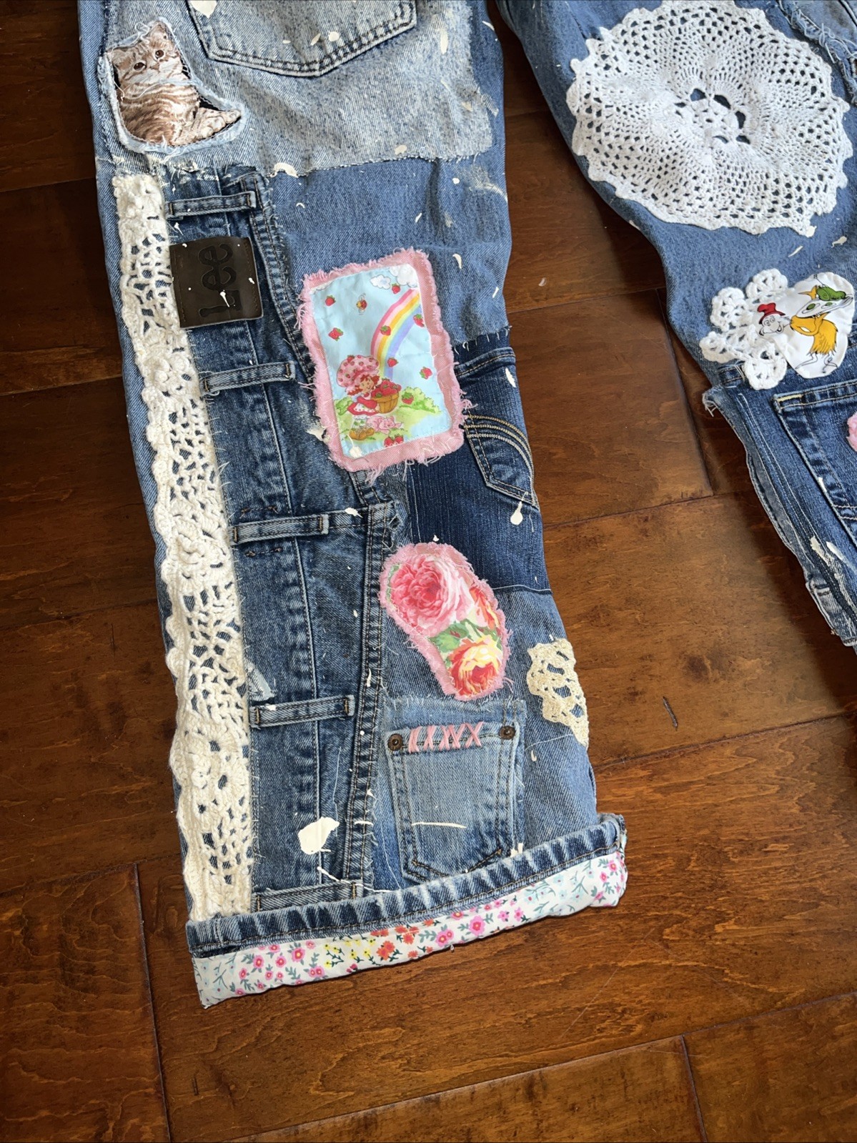 Just finished this fun colorful patchwork creation using a handful of vintage fabric pieces some from old fabric / crochet doilies collection and some more modern. 10 pockets includes 2 coin pockets. Braided sash tie belt cinches waist down easily. Belt made of cotton sashes. Waist of the jeans used measures appx 18” across, Inseam measures 34” before optional lined cuff