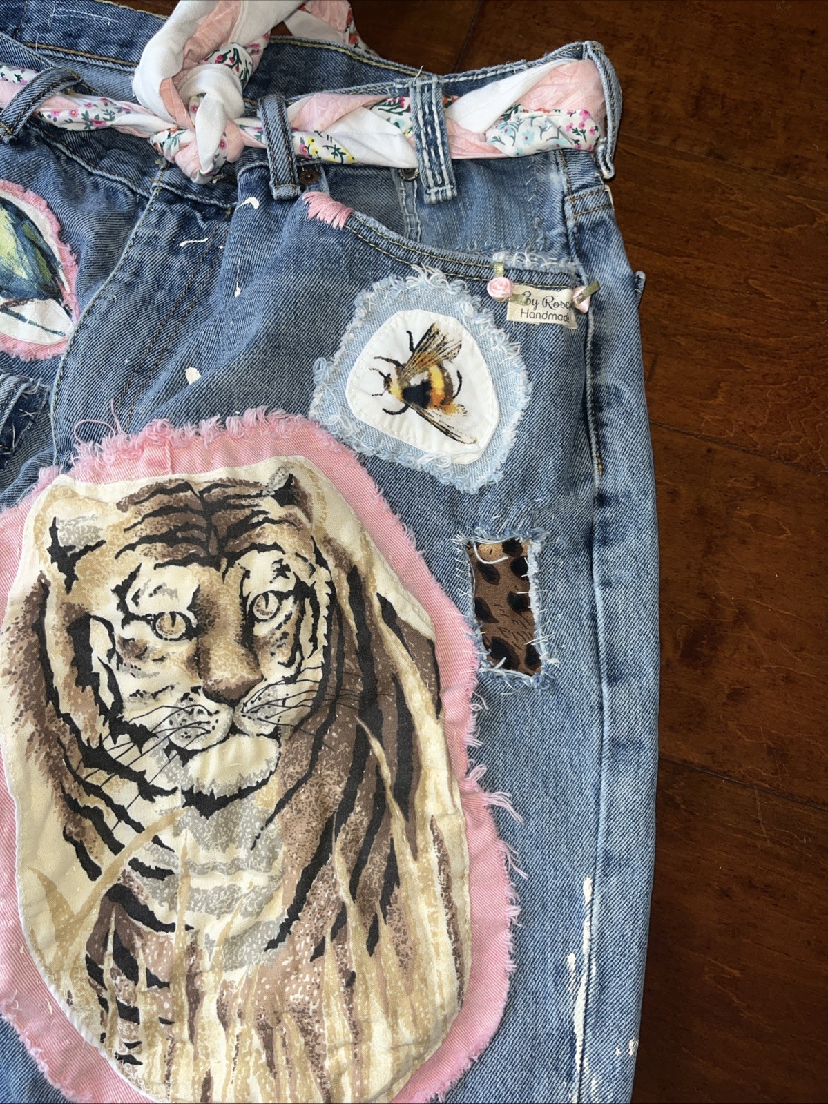 Artsy Upcycled Size 36 Levis Hippie Jeans Patchwork 10 Pockets Pearl Woodstock