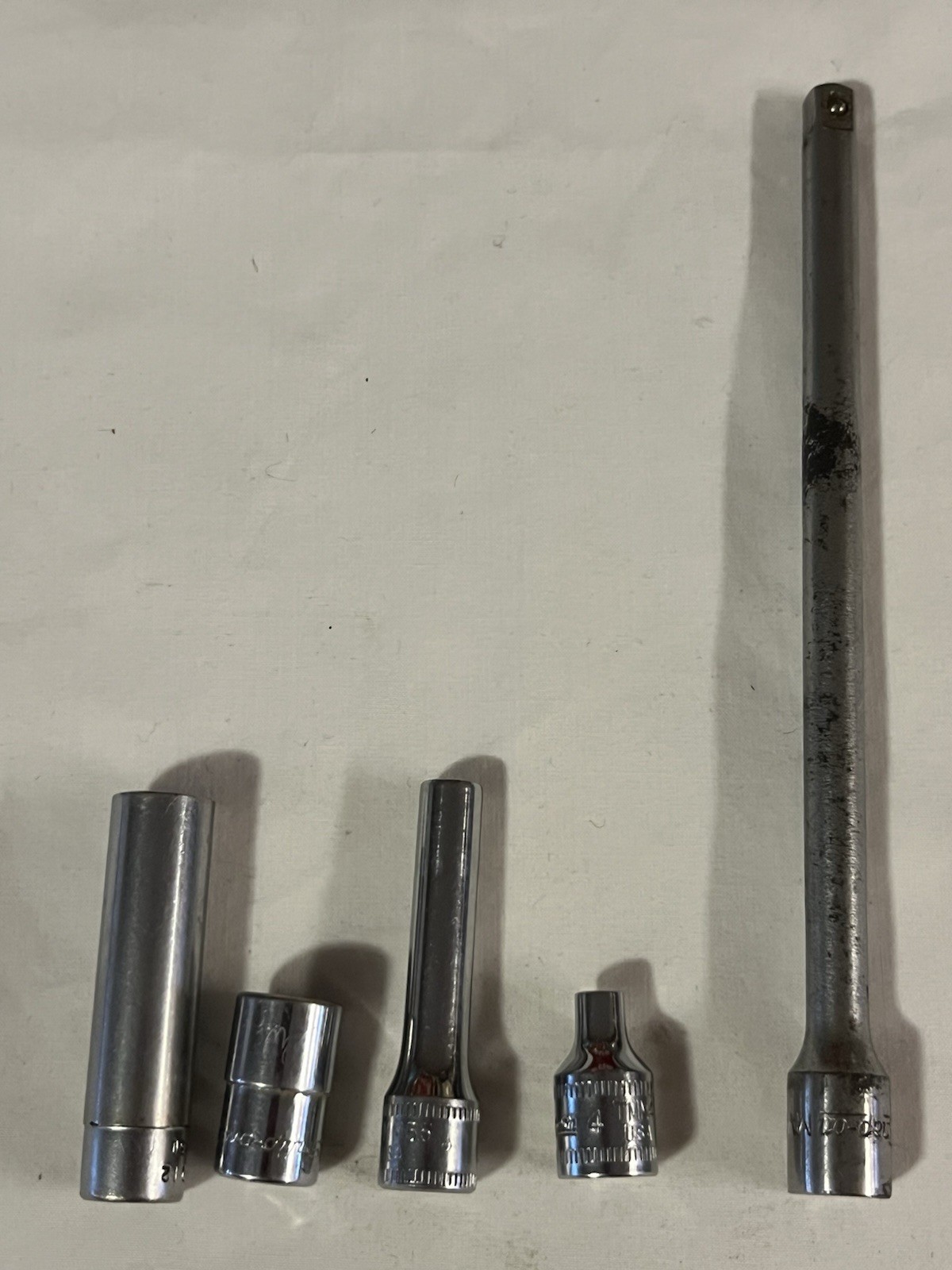 Lot Includes: 6” extension, 4mm shallow socket, 5.5mm deep socket, 3/8” shallow socket and 3/8” deep socket