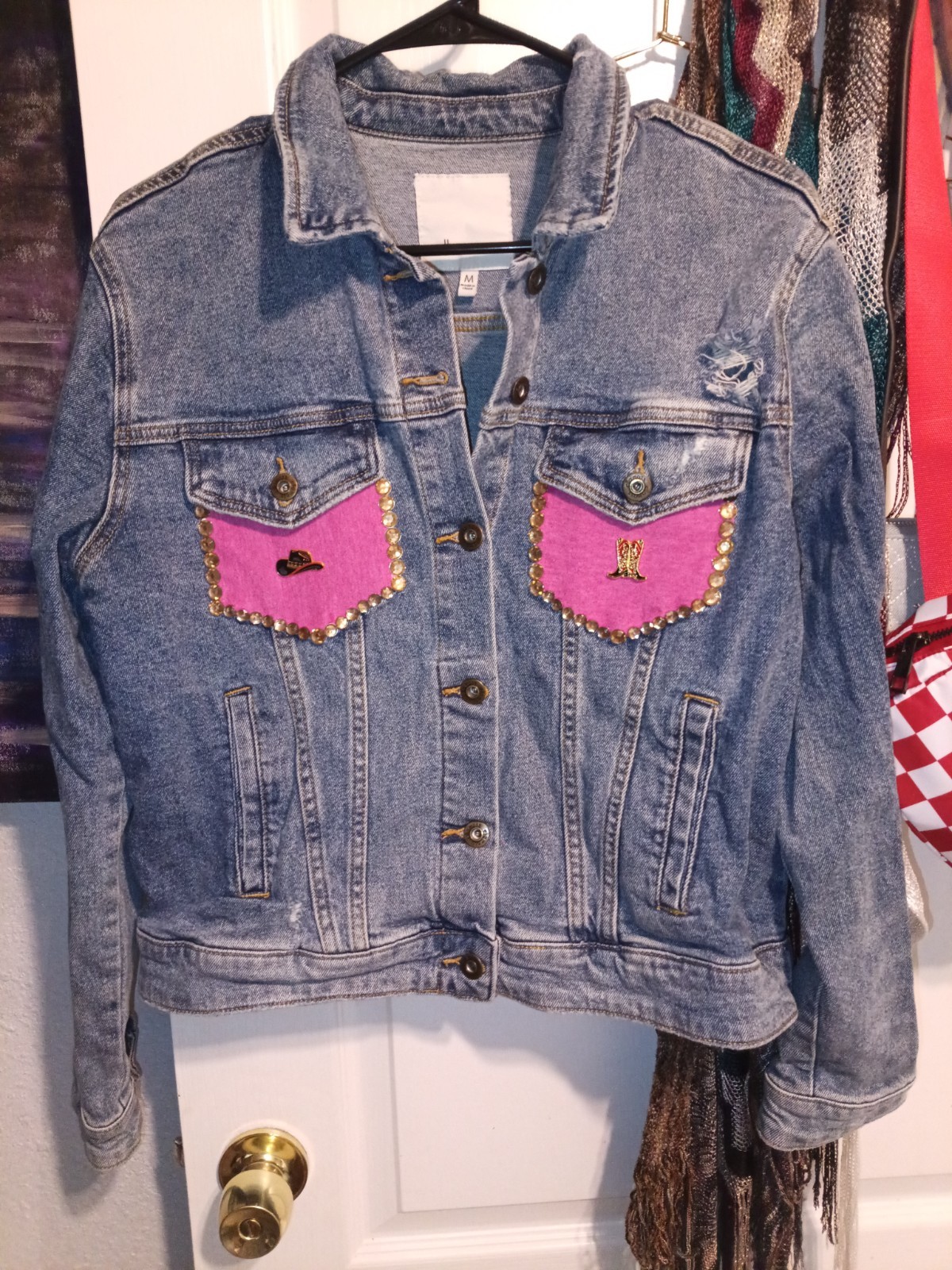 **UPCYCLED UTOPIA BOUTIQUE ORIGINAL** Upcycled/refurbished Ella Moss brand denim jacket with Western t shirt patches and bedazzled details #denimjacket