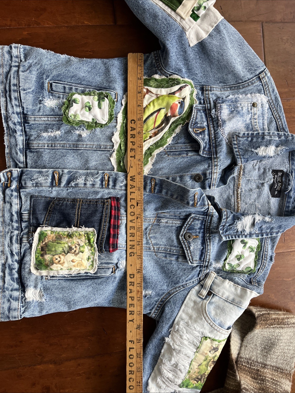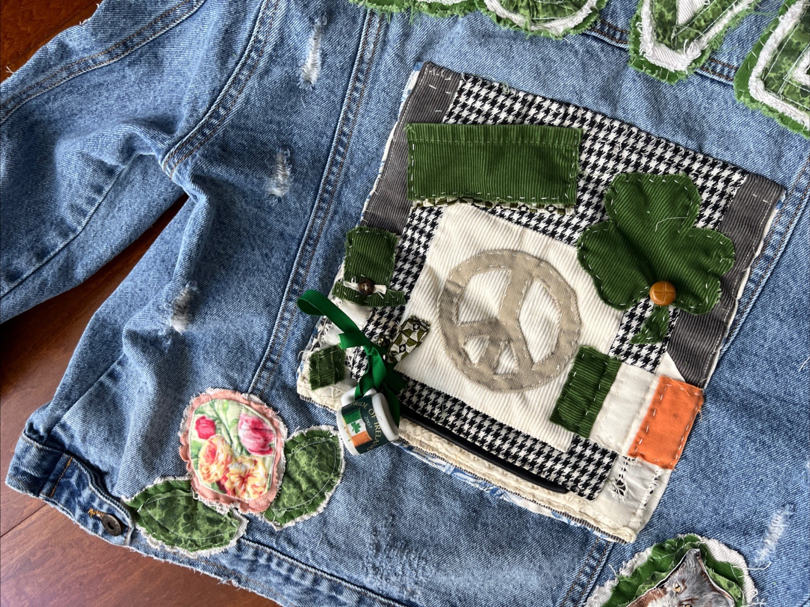 Artsy Upcycled XL Hippie Denim Jacket St Patrick’s Patchwork Woodstock 9 Pockets