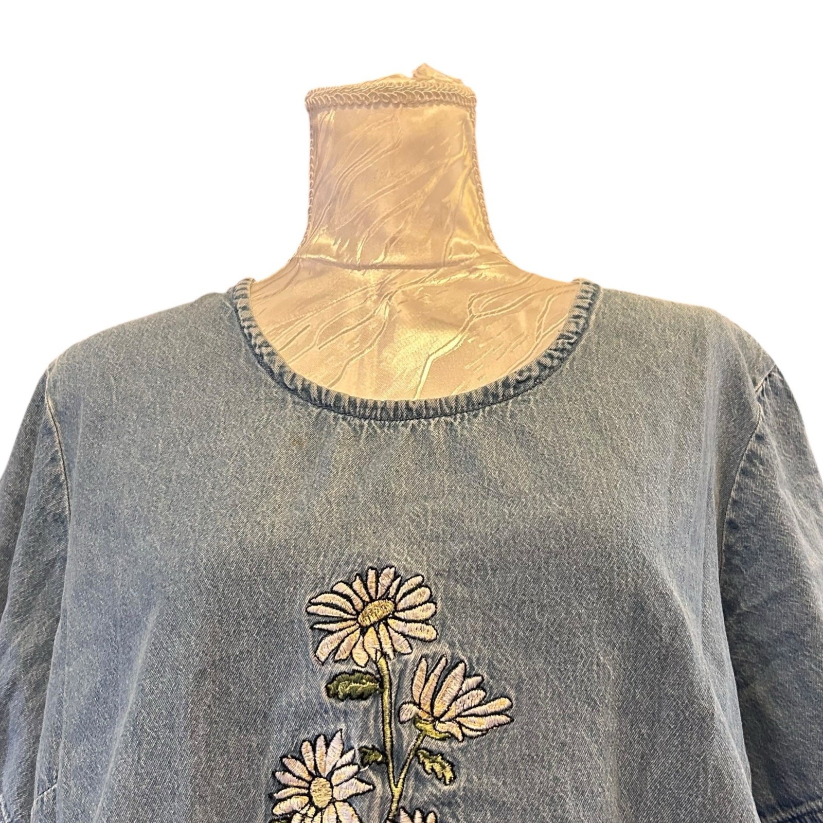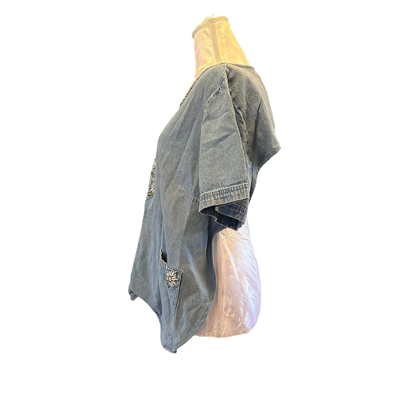 This upcycled chambray artist smock top features short sleeves, floral embroidery, front pockets, and an open‑back reworked design. Lightweight, breathable, and ideal for pottery, painting, crafting, and studio work.