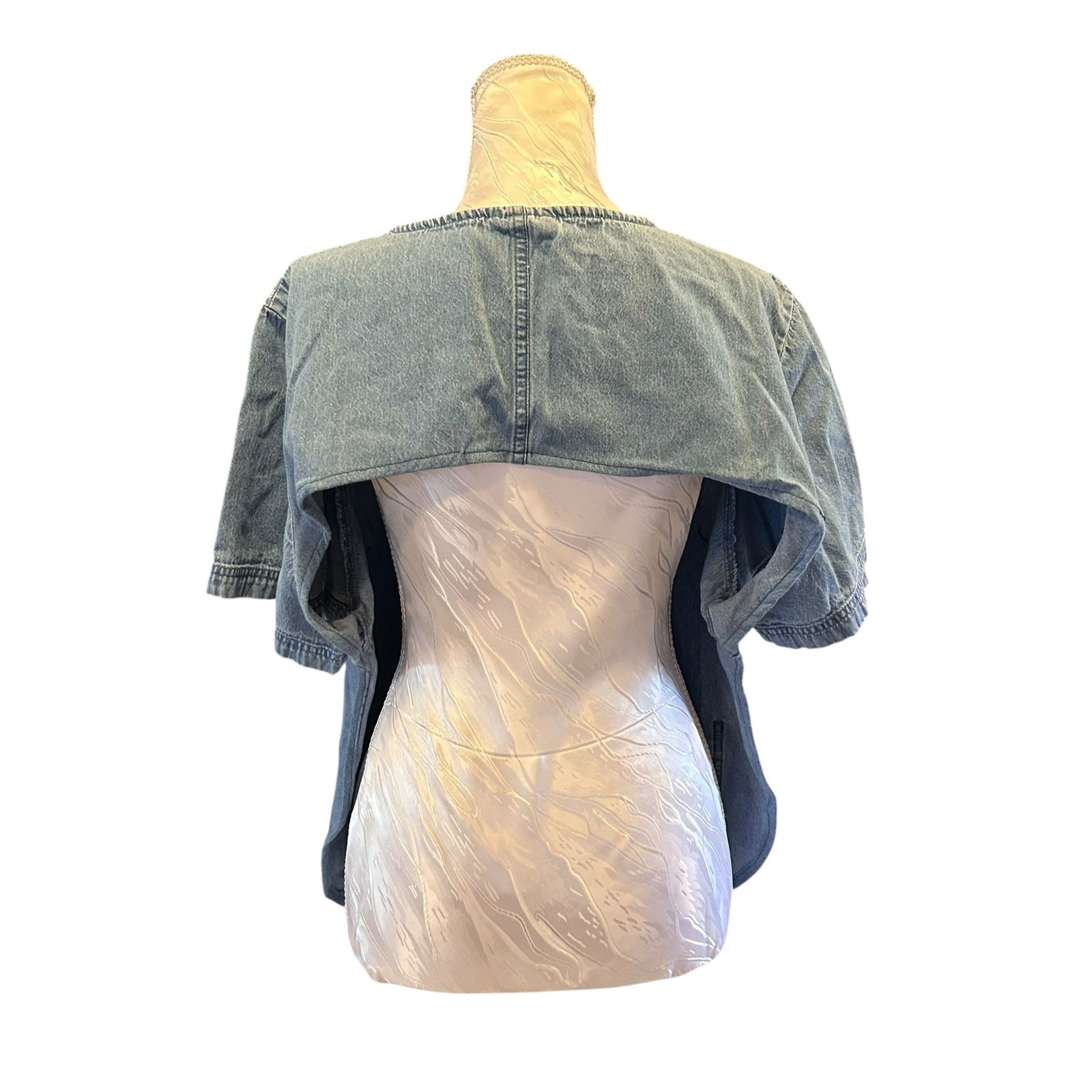 SEO Keywords: artist smock top, chambray smock, upcycled denim top, reworked shirt, open back smock, women’s L/XL