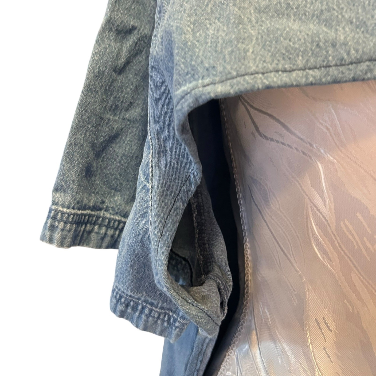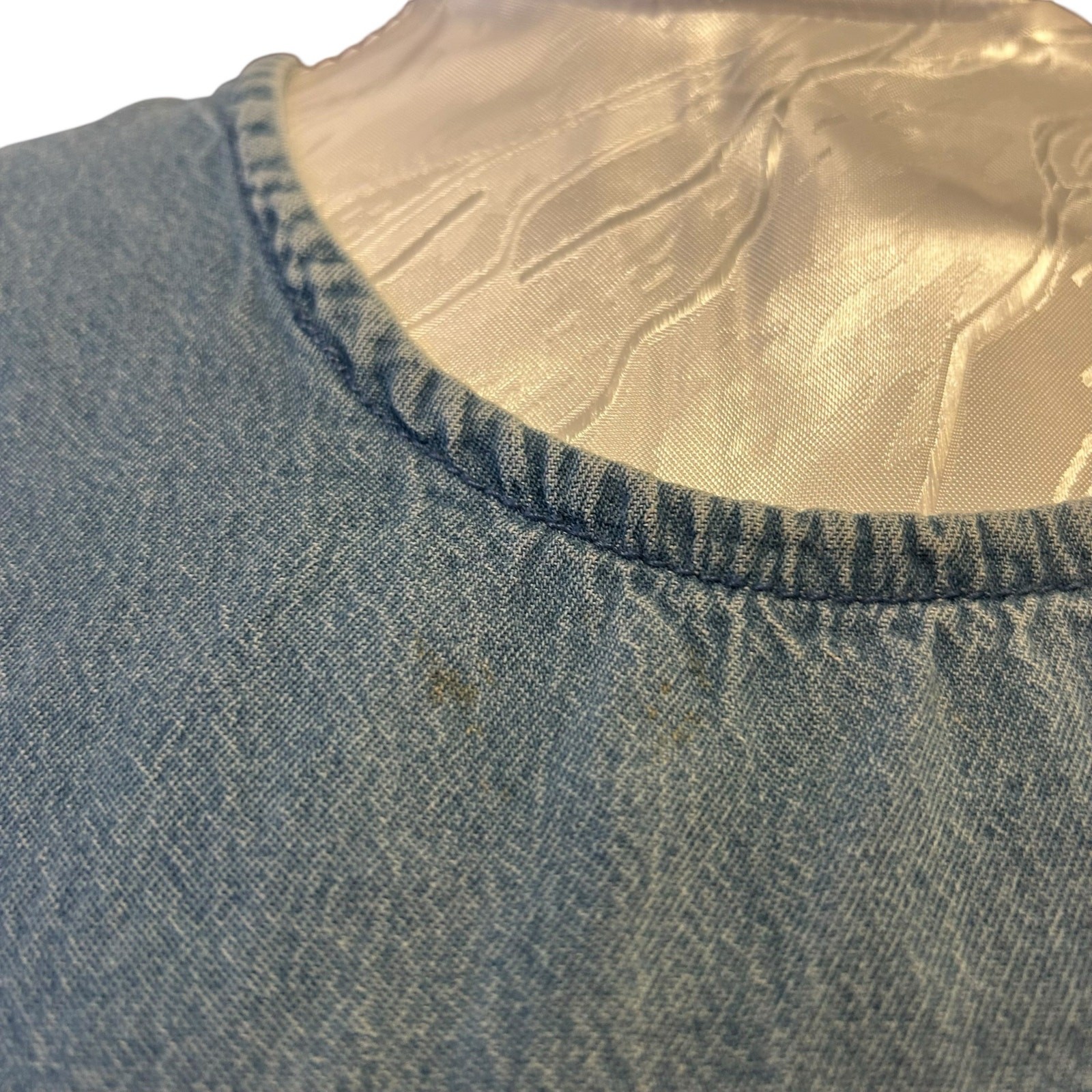 Condition: Small stain near neckline. No holes or tears. Upcycled/reworked construction. Smoke‑free, pet‑free environment.
