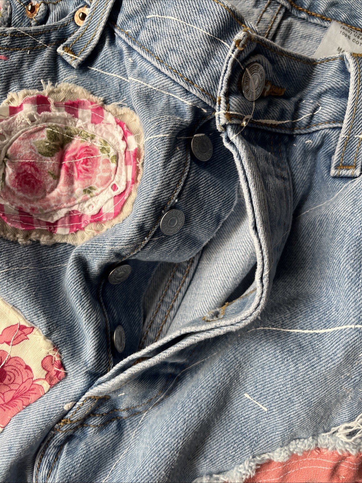 Artsy Upcycled Size 36 Levi’s Hippie Jeans Patchwork Pearl Woodstock 7 Pockets