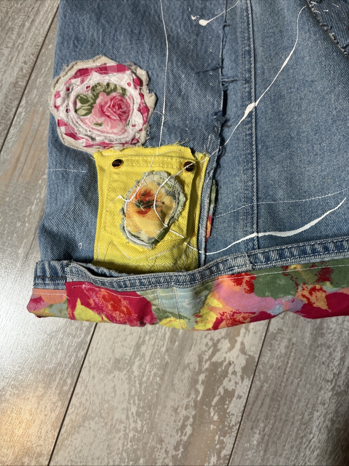 Just finished this fun colorful patchwork creation using a handful of vintage fabric pieces, some from old fabric collection and some more modern. Waist of the jeans used measures appx 17” across, Inseam measures 30” before colorful fabric lined cuff turned up hemline.