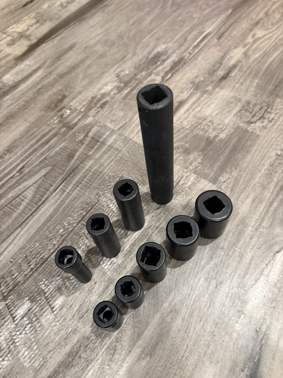 Snap-On 9pc. Misc. SAE Impact SocketsNEW - simf100a - 5/16",6pt, 3/8" drive, deep NEW - simf160 - 1/2",6pt, 3/8" drive, deep NEW - simf180 - 9/16", 6pt, 3/8" drive, deep NEW - imf160 - 1/2", 6pt, 3/8" drive, shallow NEW - imdf180 - 9/16", 12pt, 3/8" drive, shallow NEW - im180a - 9/16", 6pt, 1/2" drive, shallow NEW - s9618 - 9/16", 6pt, 1/2" drive, extra-deep NEW - p420 - 5/8", 8pt, 1/2" drive, shallow USED very little - p422 - 11/16", 8pt, 1//2" drive, shallow