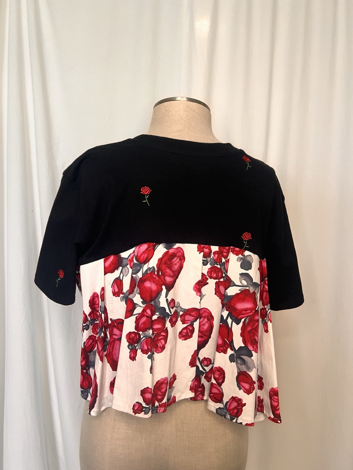 Upcycled, Sustainable: Cropped Black Red Floral Embroidered Pleated Top