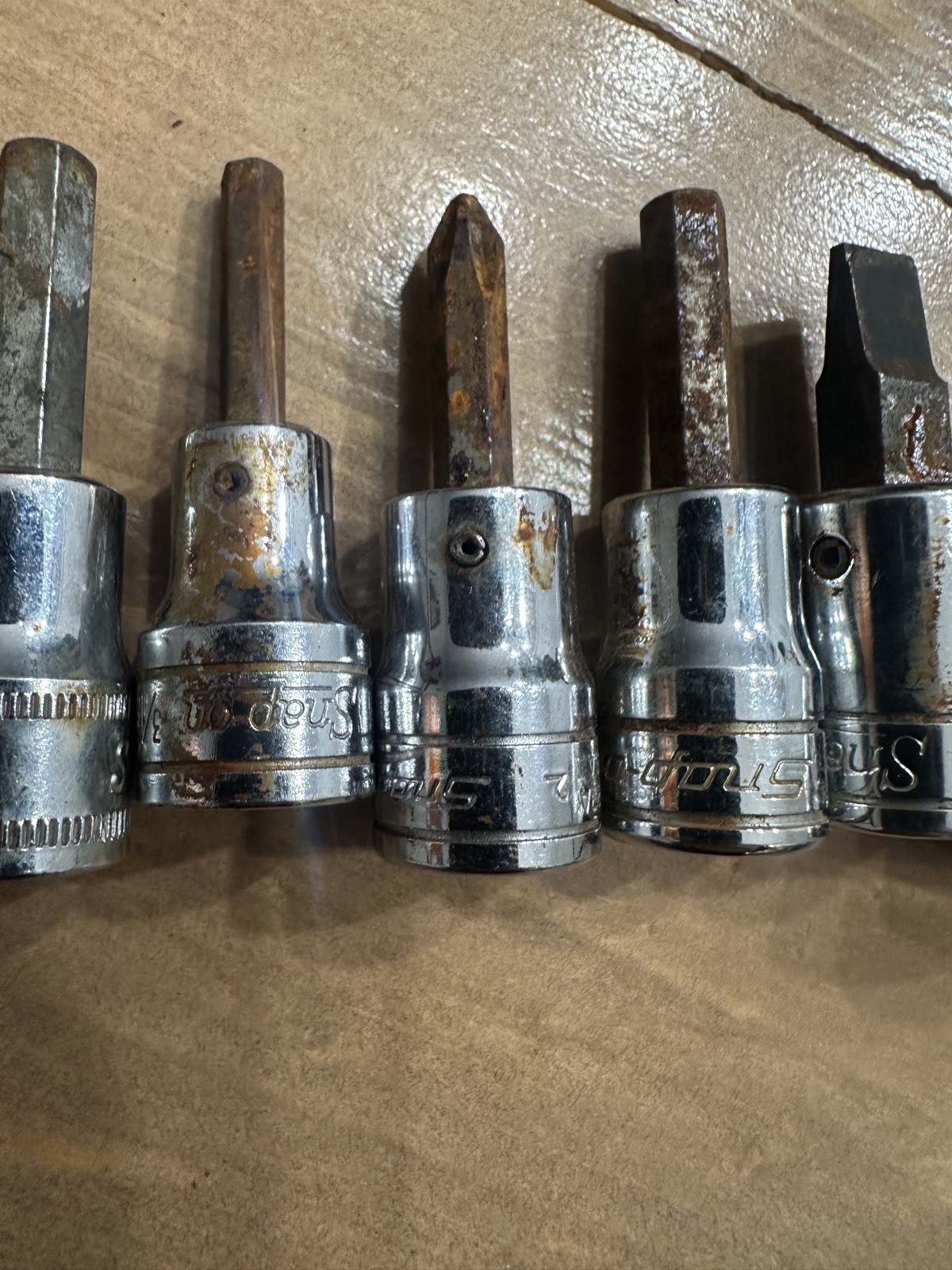 The Snap-on Tools USA Torx Sockets lot of 6 includes high-quality standard Torx sockets with a specialty system of measurement. Made in the United States with a chrome surface finish, these sockets are designed for use with a 3/8 inch drive size. The set includes six different Torx sockets, each manufactured by Snap-on with a unique part number. While these sockets do not come with a warranty, they are a reliable and durable addition to any tool collection for fastening and loosening nuts and bolts with precision.
