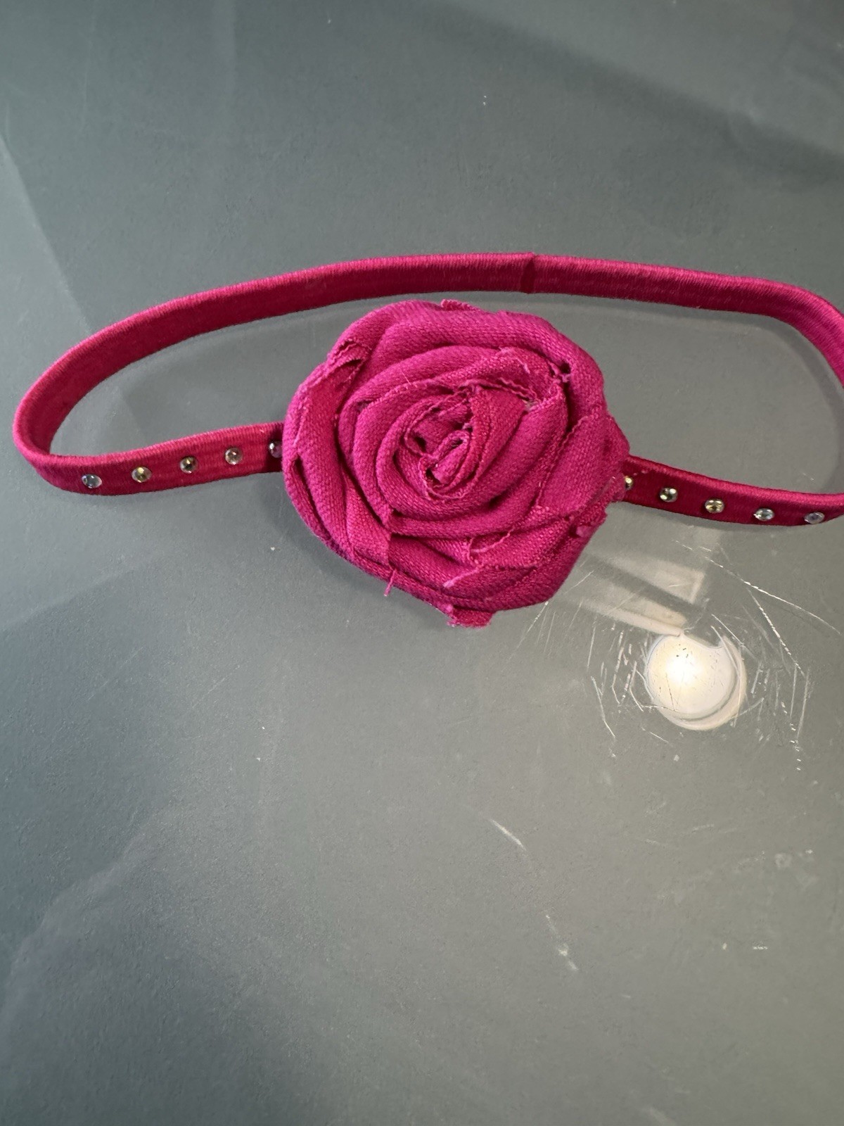 This product is a stylish upcycled headband handmade from pink jeans into a pretty rose on a thin pink stretch headband with faux “gems”, perfect for anyone