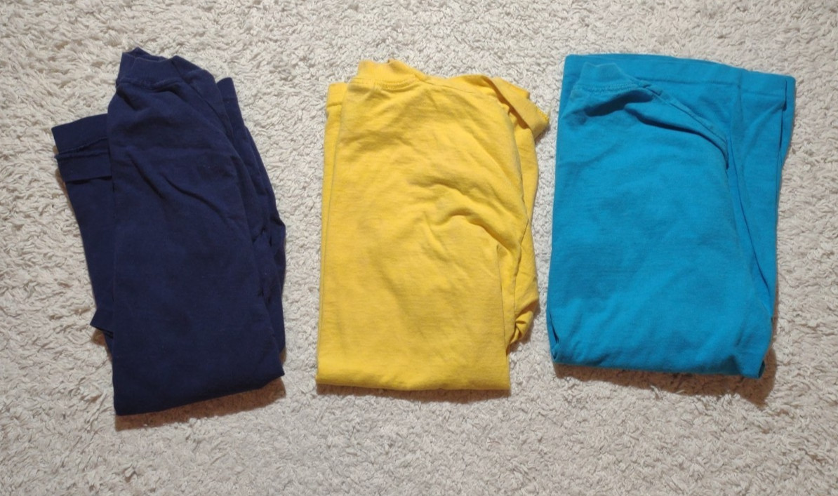 Good pre-owned condition. No rips. Yellow shirt has some discoloring and a small hole. Two blue shirts are very good.