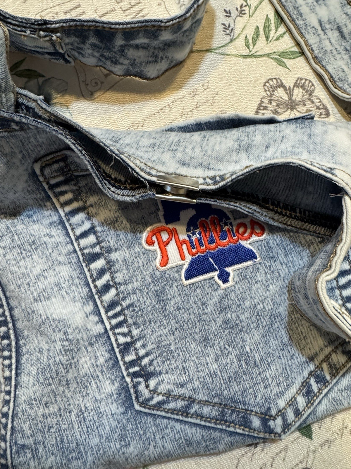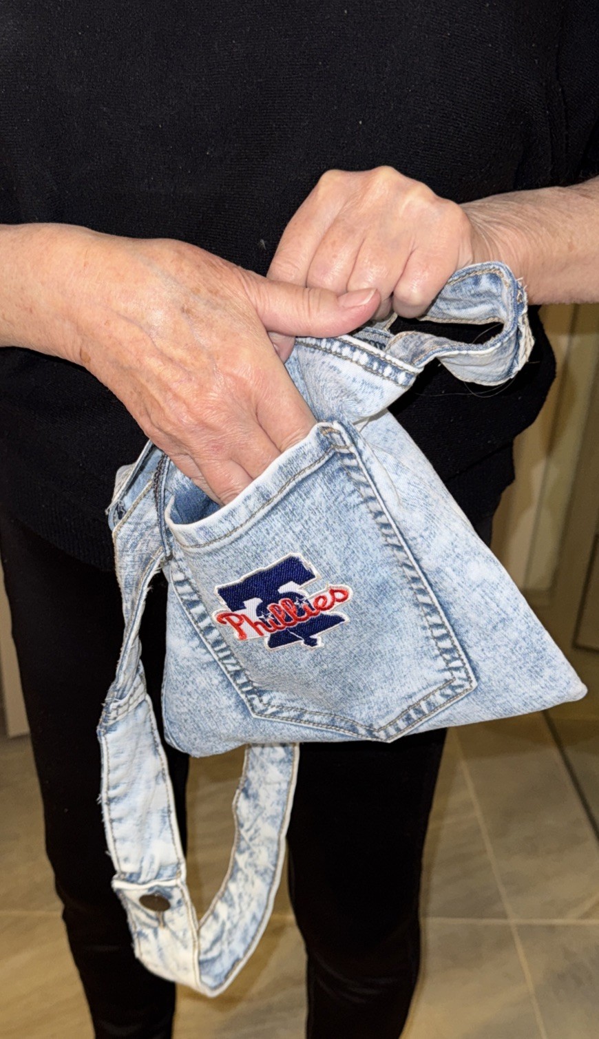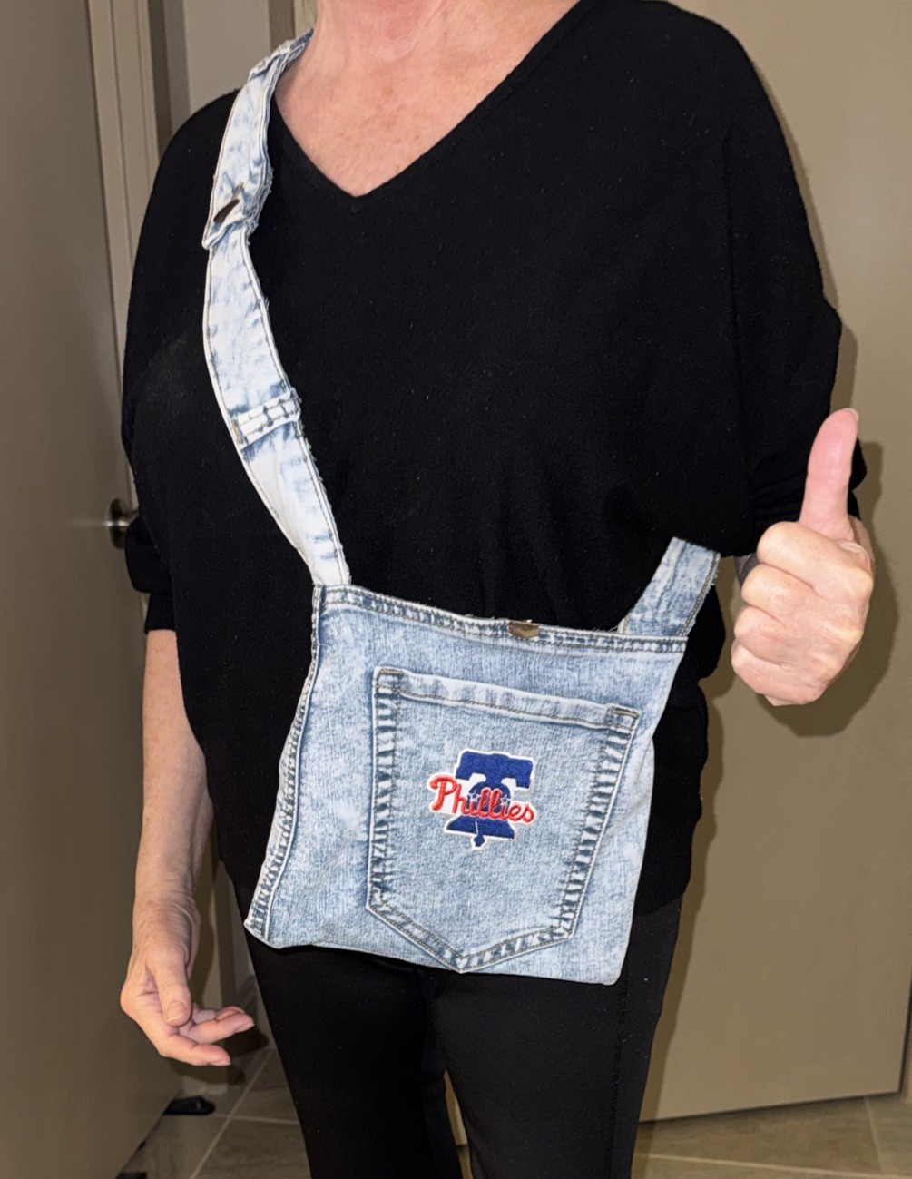 This product is a unique and eco-friendly upcycled denim jeans crossbody bag featuring a Philadelphia Phillies baseball theme. The square-shaped bag has a magnetic closure and a denim crossbody strap, with silver hardware. Made in the United States, this unisex adults' bag is crafted from denim fabric and is made from Forever 21 jeans. Perfect for any fan of the Phillies or environmentally conscious consumers, this one-of-a-kind bag combines style and sustainability in a creative way.