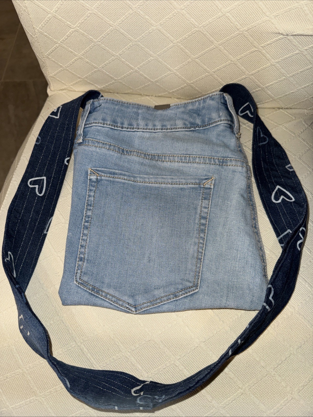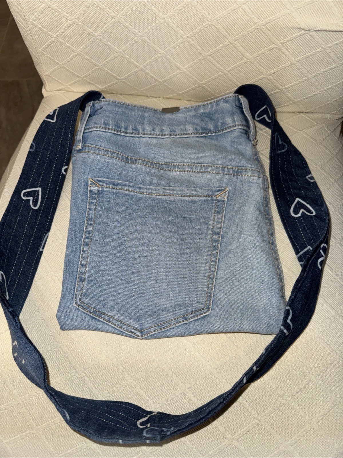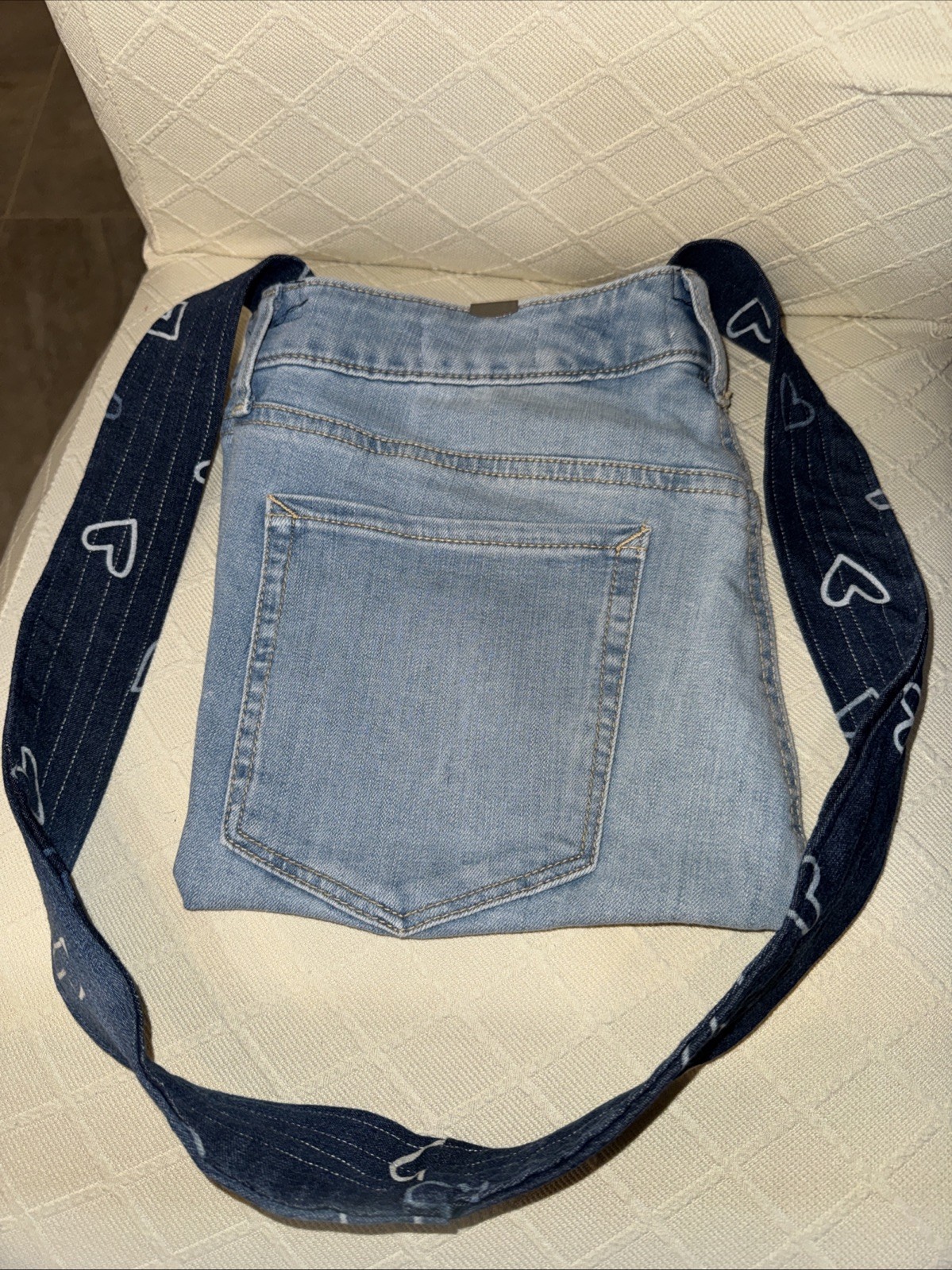 This product is a unique and eco-friendly upcycled denim jeans shoulder bag featuring a Philadelphia Phillies baseball theme. The square-shaped bag has a magnetic closure and a denim hearts strap, with silver hardware. Made in the United States, this unisex adults' bag is crafted from denim fabric and is made from upcycled jeans. Perfect for any fan of the Phillies or environmentally conscious consumers, this one-of-a-kind bag combines style and sustainability in a creative way. Cute to wear at Love Park in Philadelphia.